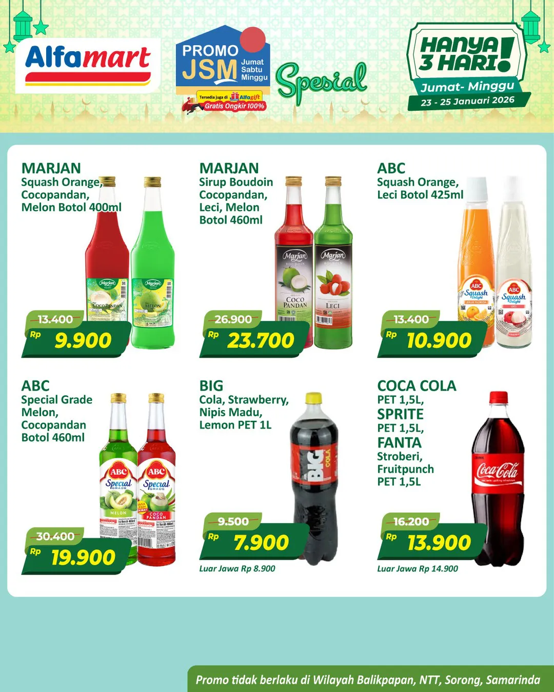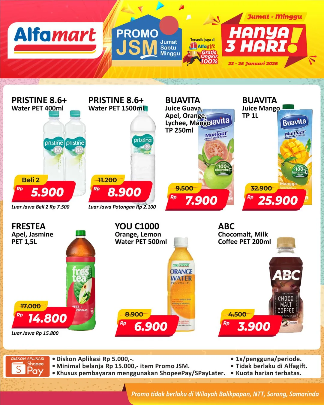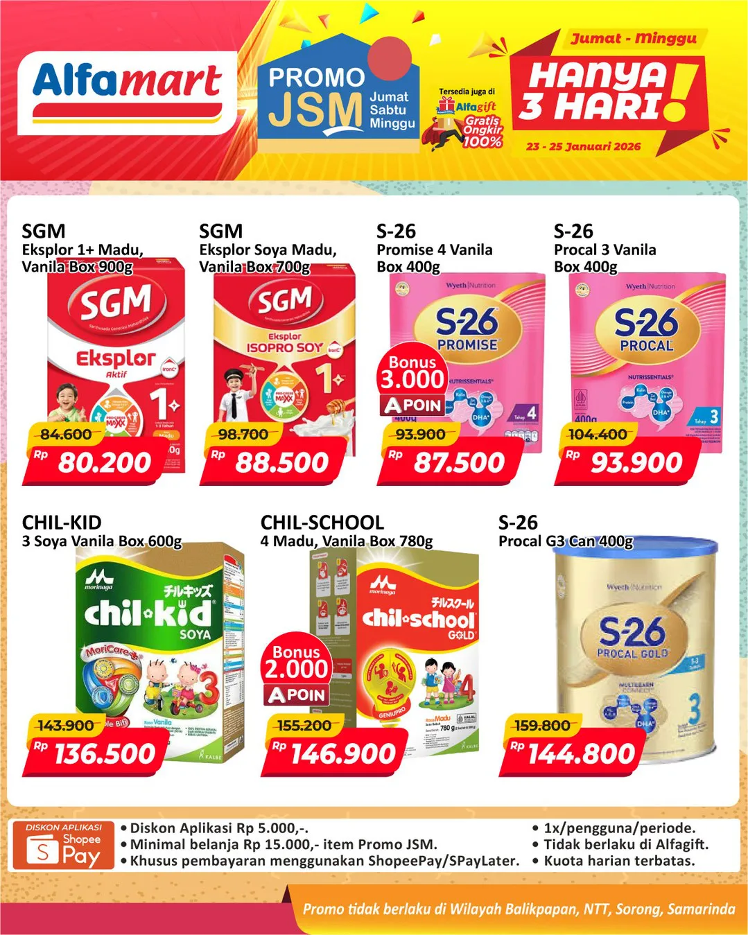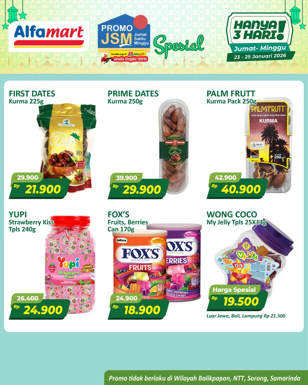 Harga promo JSM Alfamart periode 23-25 Januari 2026 tidak berlaku di wilayah NTT, Balikpapan, Samarinda, dan Sorong ya Moms.