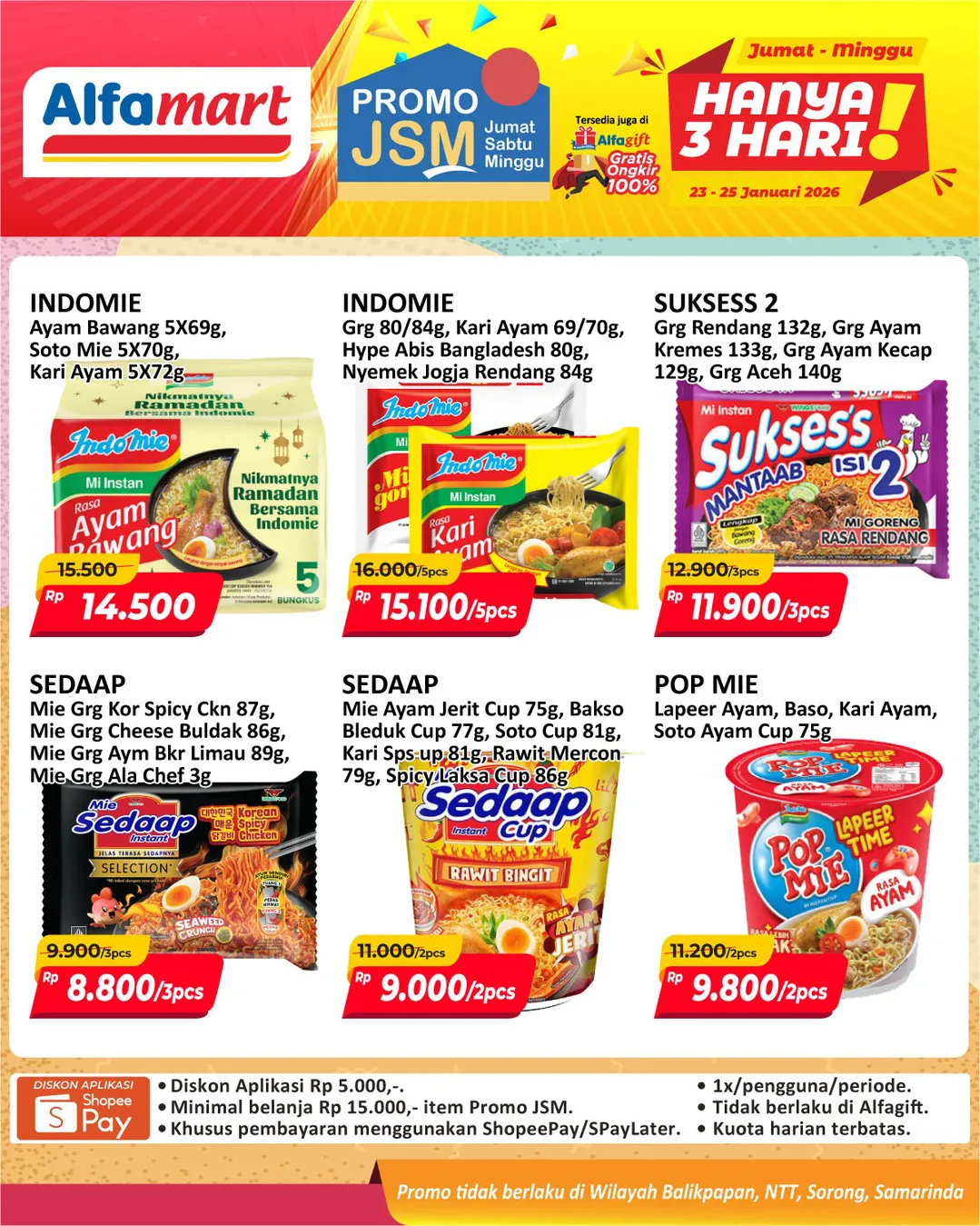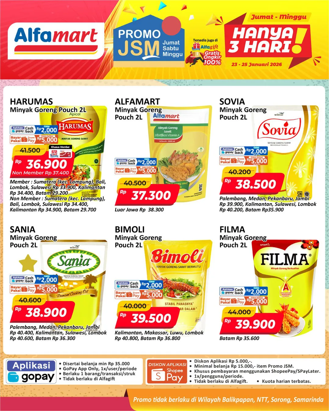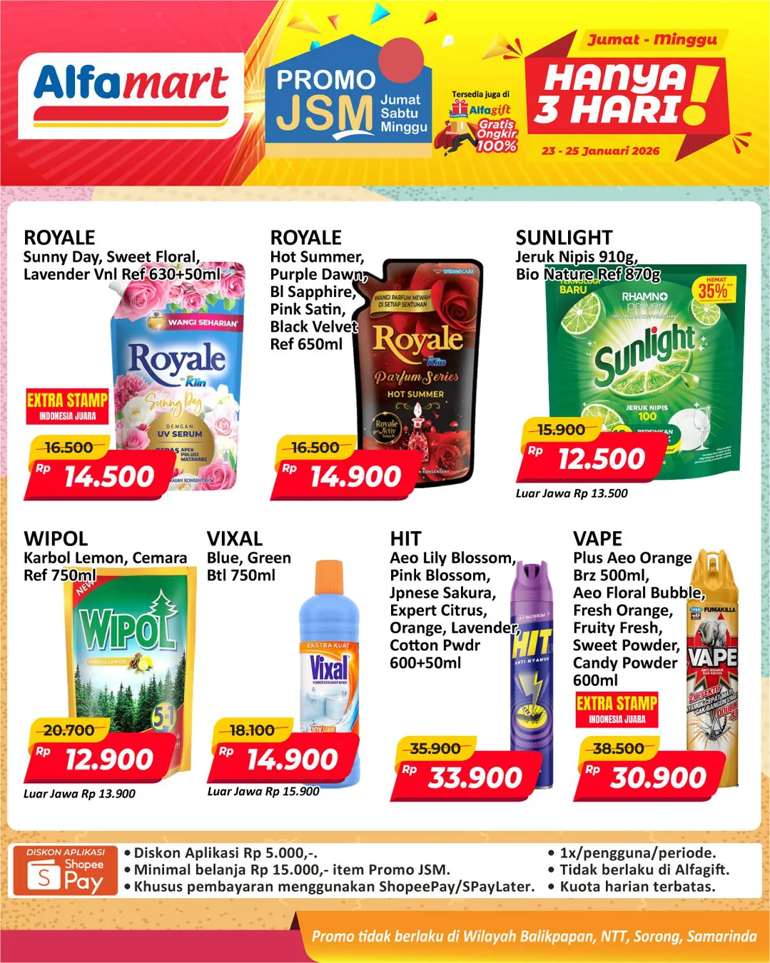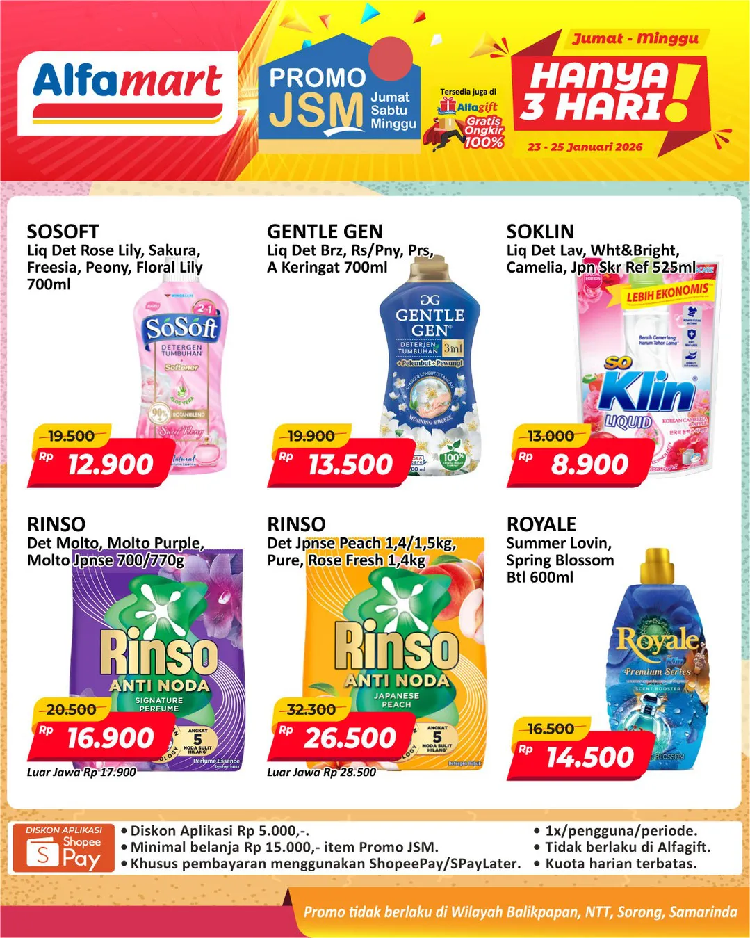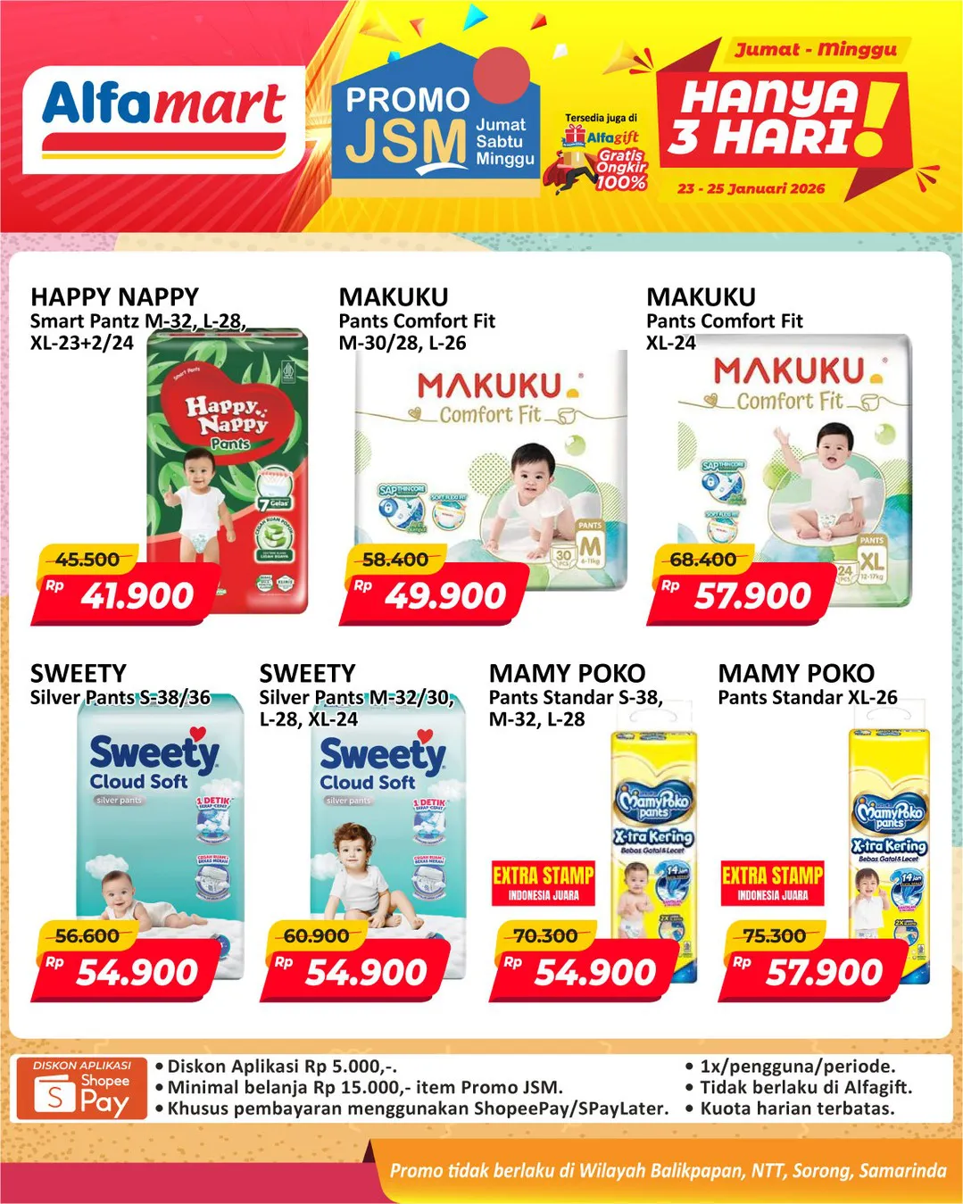 Harga promo JSM Alfamart periode 23-25 Januari 2026 tidak berlaku di wilayah NTT, Balikpapan, Samarinda, dan Sorong ya Moms.