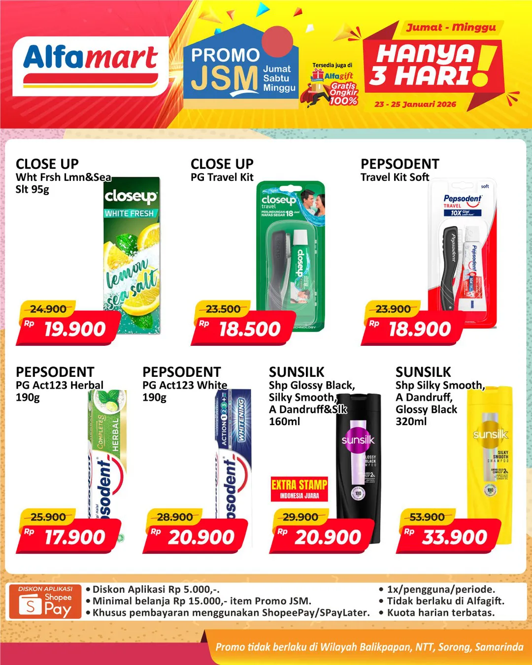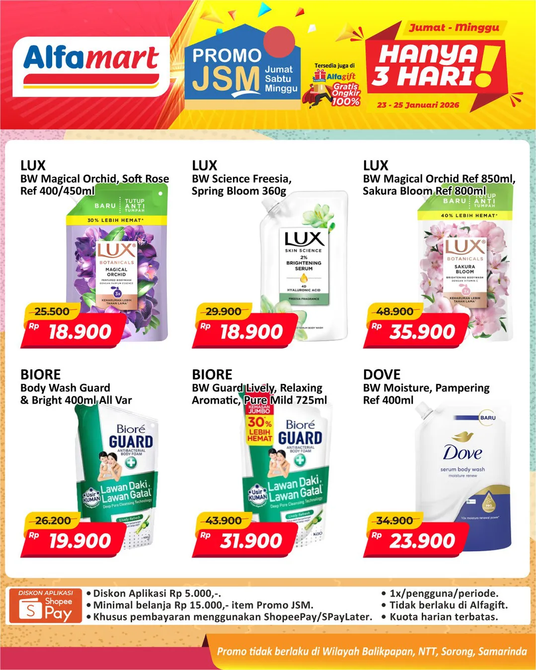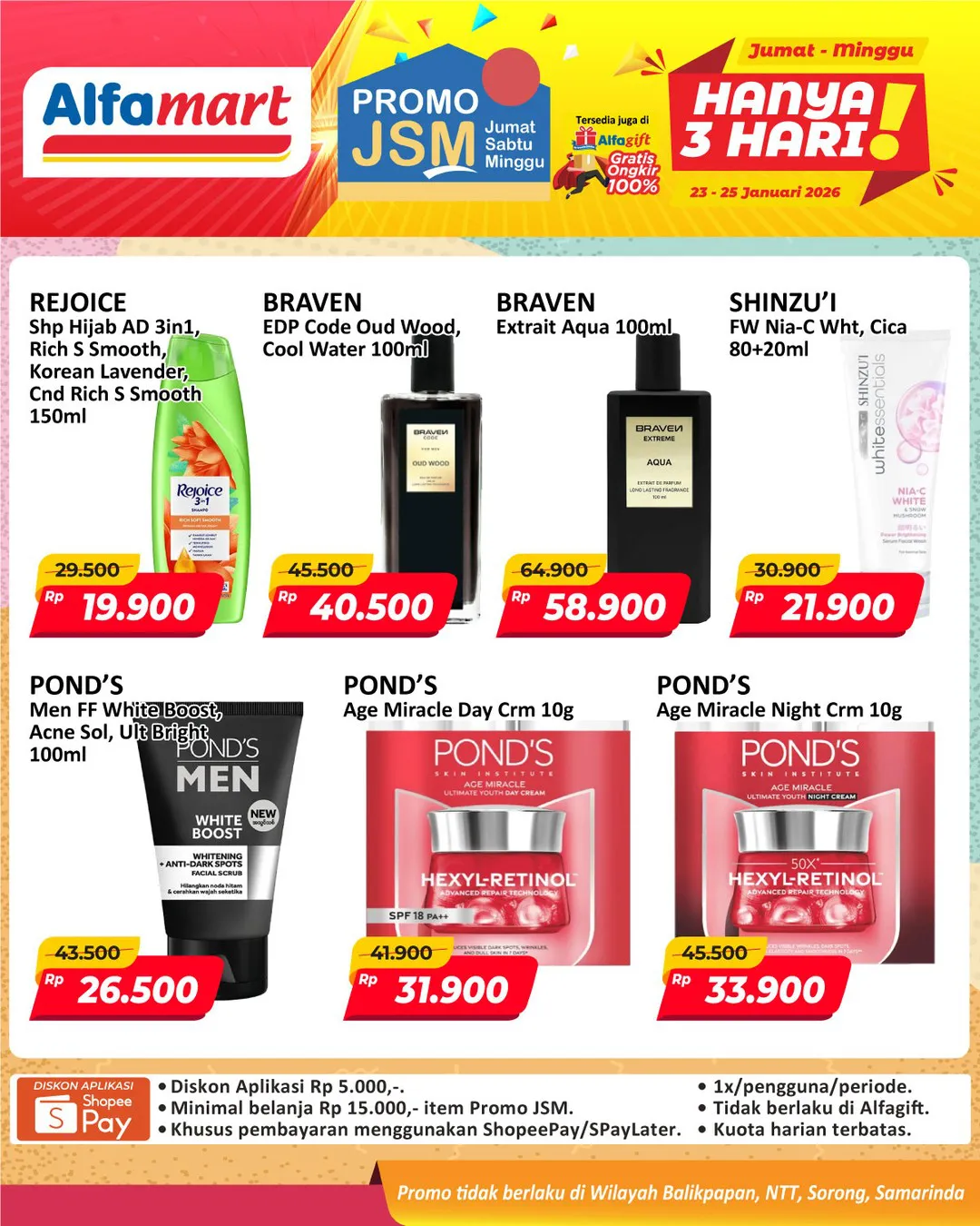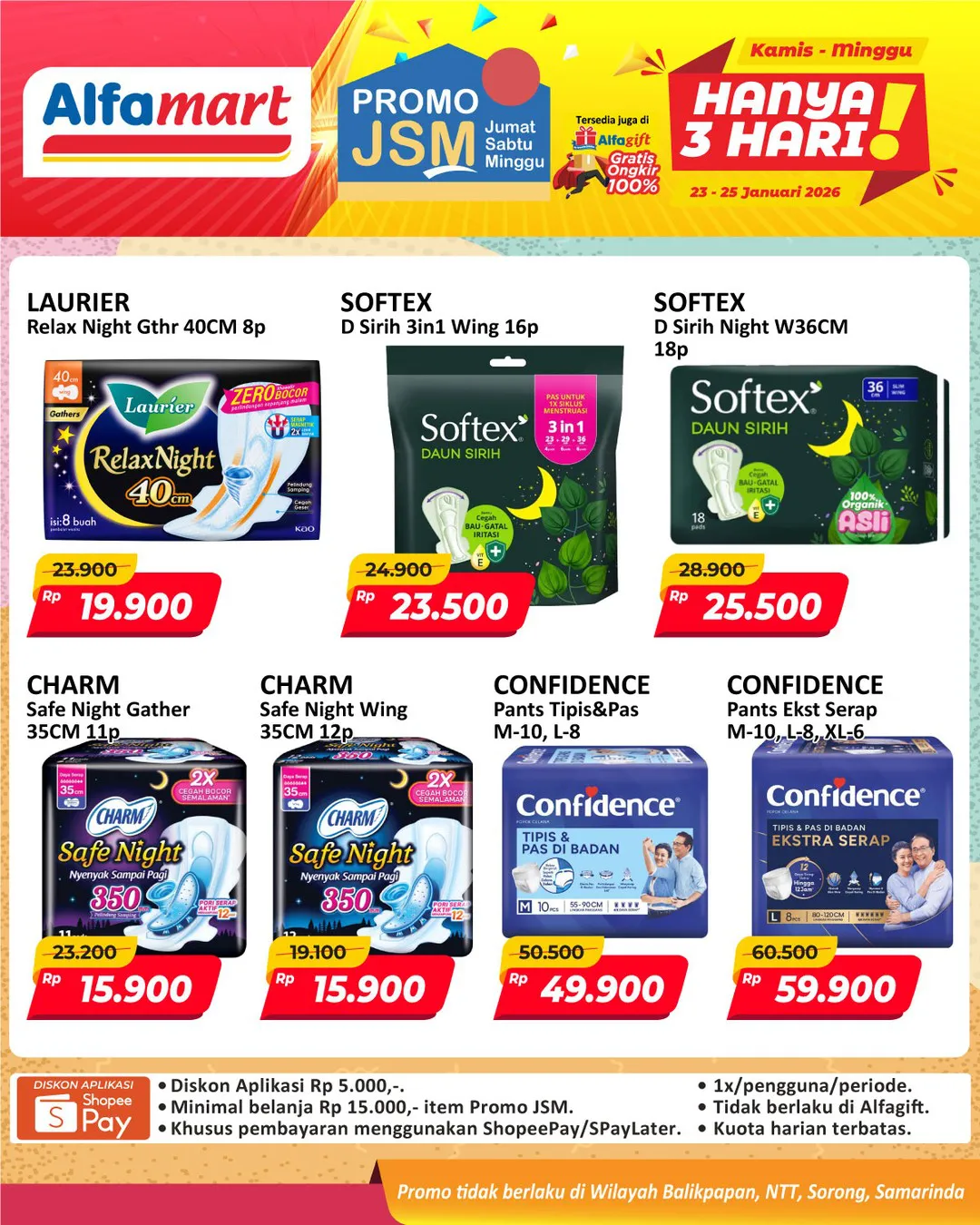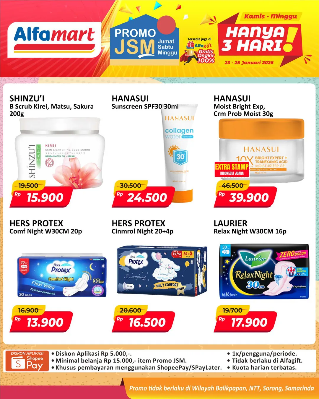 Harga promo JSM Alfamart periode 23-25 Januari 2026 tidak berlaku di wilayah NTT, Balikpapan, Samarinda, dan Sorong ya Moms.