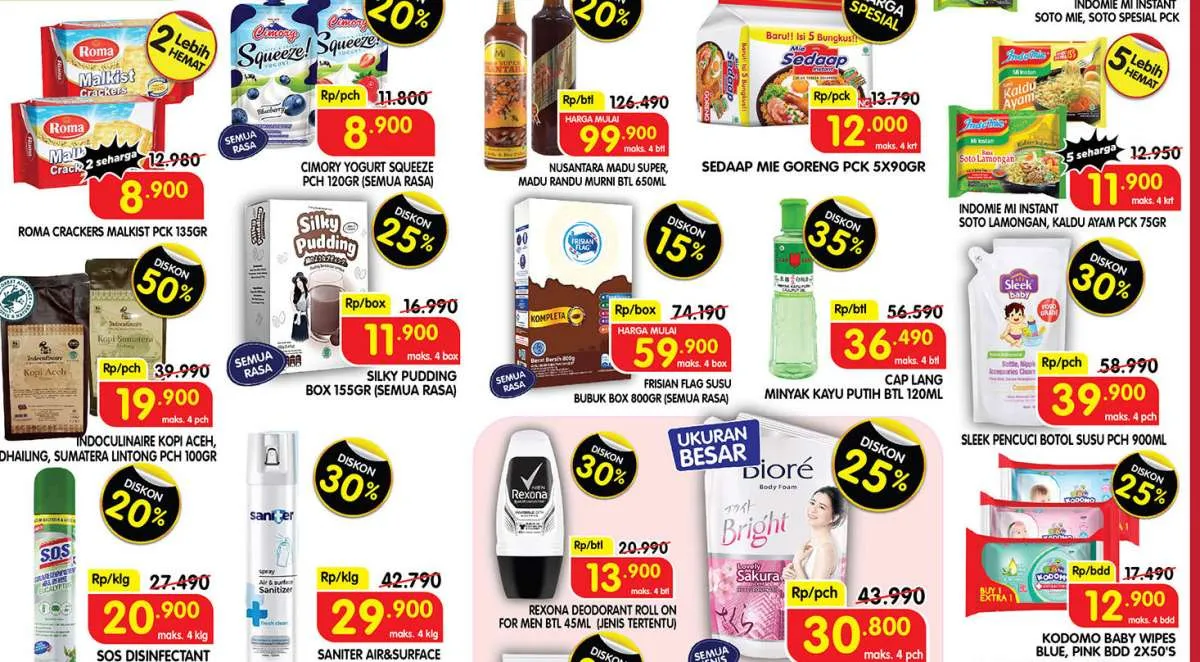 Promo ini menawarkan aneka bahan makanan, minuman, produk perawatan tubuh, hingga kebutuhan si kecil yang dibanderol dengan Diskon s/d 50%.