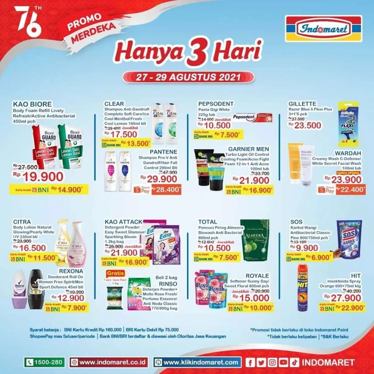 Melansir instagram Indomaret (@indomaret), inilah katalog Promo Merdeka Indomaret Hanya 3 Hari Periode 27-29 Agustus 2021: