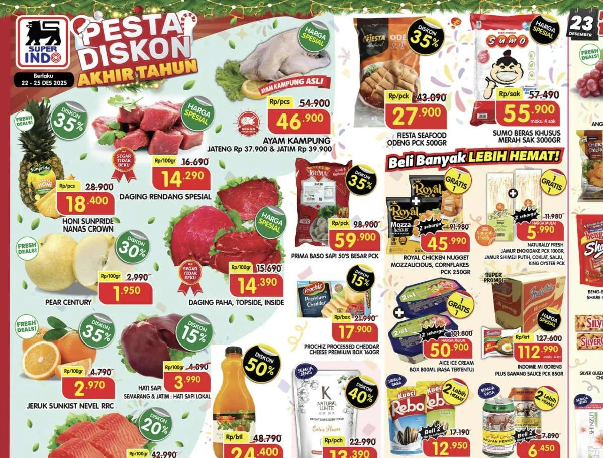 Pada awal pekan ini, 22-25 Desember 2025, di Superindo terdekat juga ada promo Superindo Weekday yang menawarkan Diskon sampai 50% untuk berbagai produk. Berikut beberapa di antaranya: