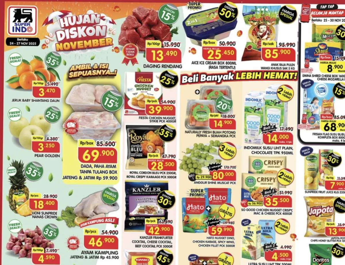 Pada awal pekan ini, 24-27 November 2025, di Superindo terdekat juga ada promo Superindo Weekday yang menawarkan Diskon sampai 50% untuk berbagai produk. Berikut beberapa di antaranya: