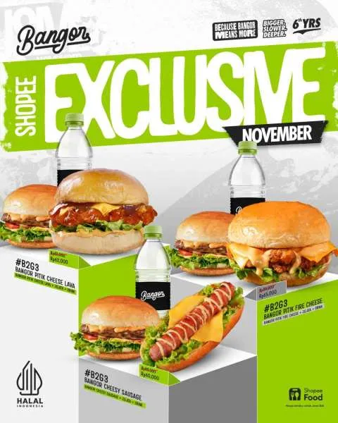 - B2G3 Bangor Cheesy Sausage (Rp 60.000): Bangor Cheesy Sausage + Jelata + Drink
