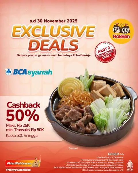 Selain itu, untuk Anda pengguna BCA Syariah jangan sampai melewatkan promo Exclusive Deals di HokBen ya. Adan cashback sampai 50% yang bisa Anda dapatkan lo.