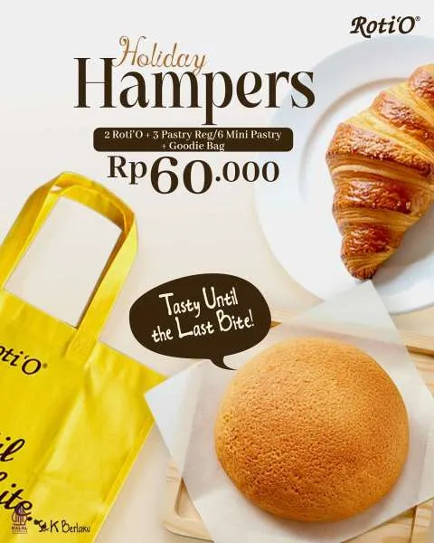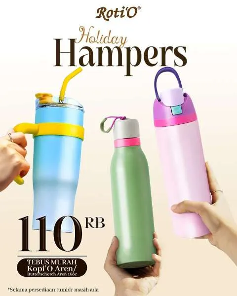 Selain itu, Roti'O juga ada promo Holiday Hampers. Tersedia hampers Roti'O dan Tumbler keren yang bisa Anda kirimkan ke orang terdekat untuk berbagi kebahagiaan.