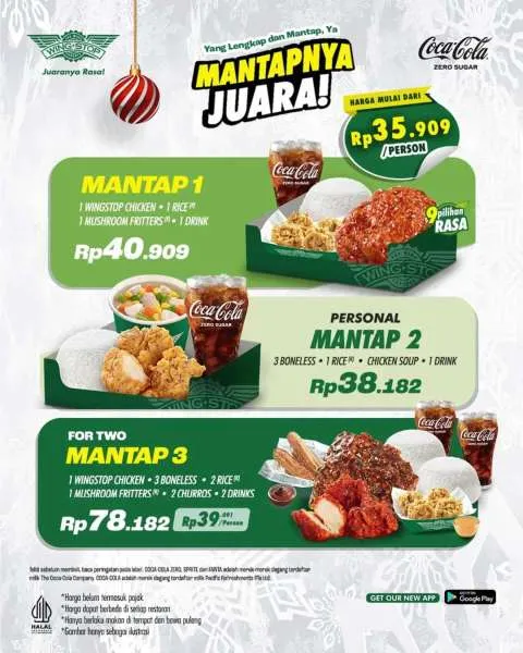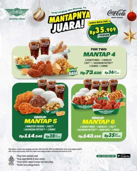 - Mantap 1 (Rp 40.909): 1 Wingstop + 1 Rice (R) + 1 Mushroom Fritters (R) + 1 Drinks