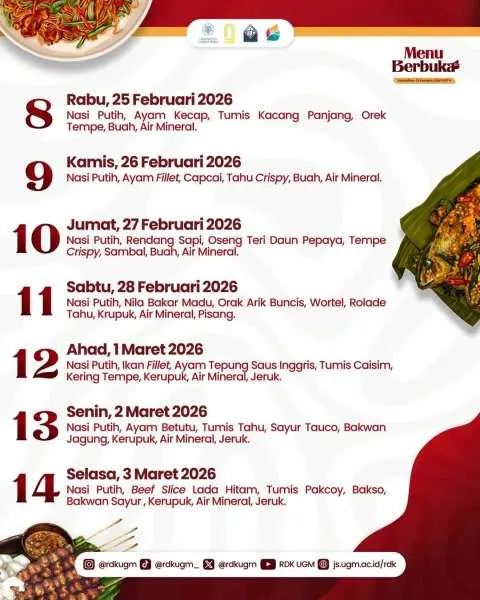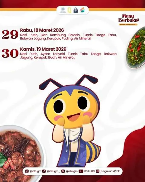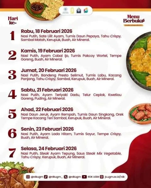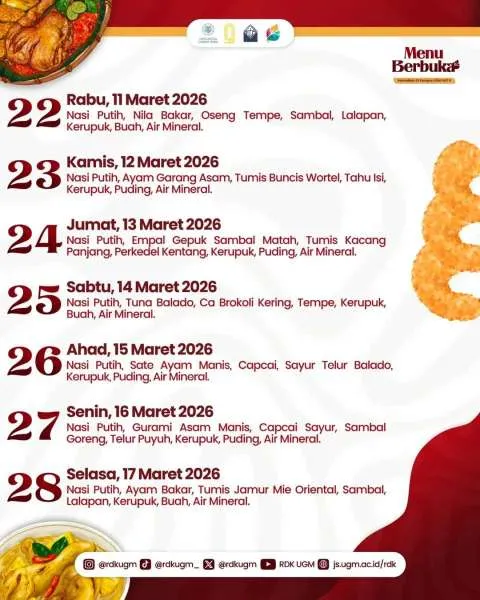 Berikut daftar menu berbuka puasa Ramadhan 2026 di Masjid UGM yang dikutip dari Instagram @masjidkampusugm: