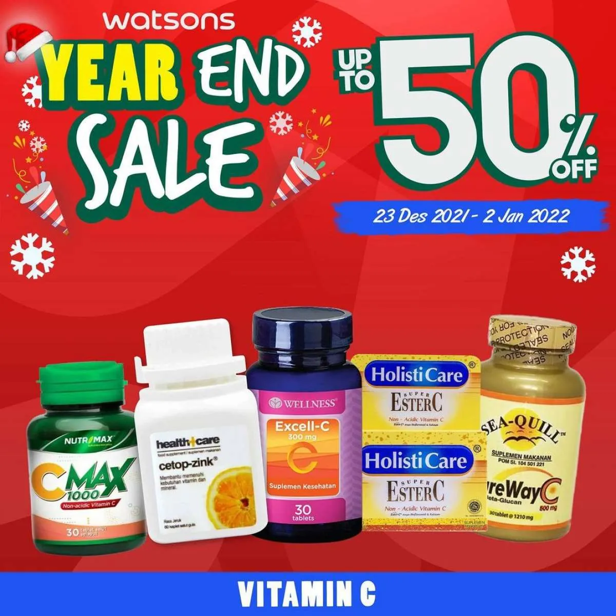 Berlaku 23 Desember 2021-2 Januari 2022, promo Watsons kali ini menawarkan Diskon hingga 50% Off untuk berbagai merek Vitamin C dan Vitamin D.