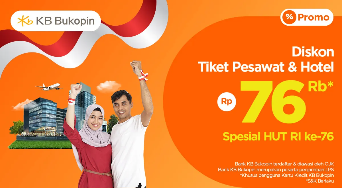 MOMSMONEY.ID - Menyambut HUT RI ke-76 dengan diskon tiket pesawat dan hotel sebesar Rp76.000 dari KB Bukopin. Promo ini khusus bagi pengguna kartu kredit bank KB Bukopin. Periode booking dimulai hari ini s.d. 17 Agustus 2021. Periode keberangkatan dan inap tentunya bisa kapan saja!