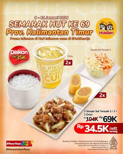 Dikutip dari Instagram @hokben_id, hanya dengan Rp 69.000, Anda sudah mendapatkan 2 Simple Set Teriyaki 1/2 + 2 Ocha, dari harga normalnya Rp 104.000. Hemat banget kan?