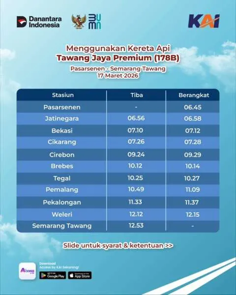 Program ini menggunakan Kereta Api Tawang Jaya Premium dengan jadwal keberangkatan pada tanggal 17 Maret 2026 dari Stasiun Pasarsenen menuju Stasiun Semarang Tawang. Pemesanan bisa dilakukan mulai tanggal 13 Februari 2026 pukul 09.00 WIB melalui aplikasi Access by KAI. /2026/02/12/1922623457p.jpg)
