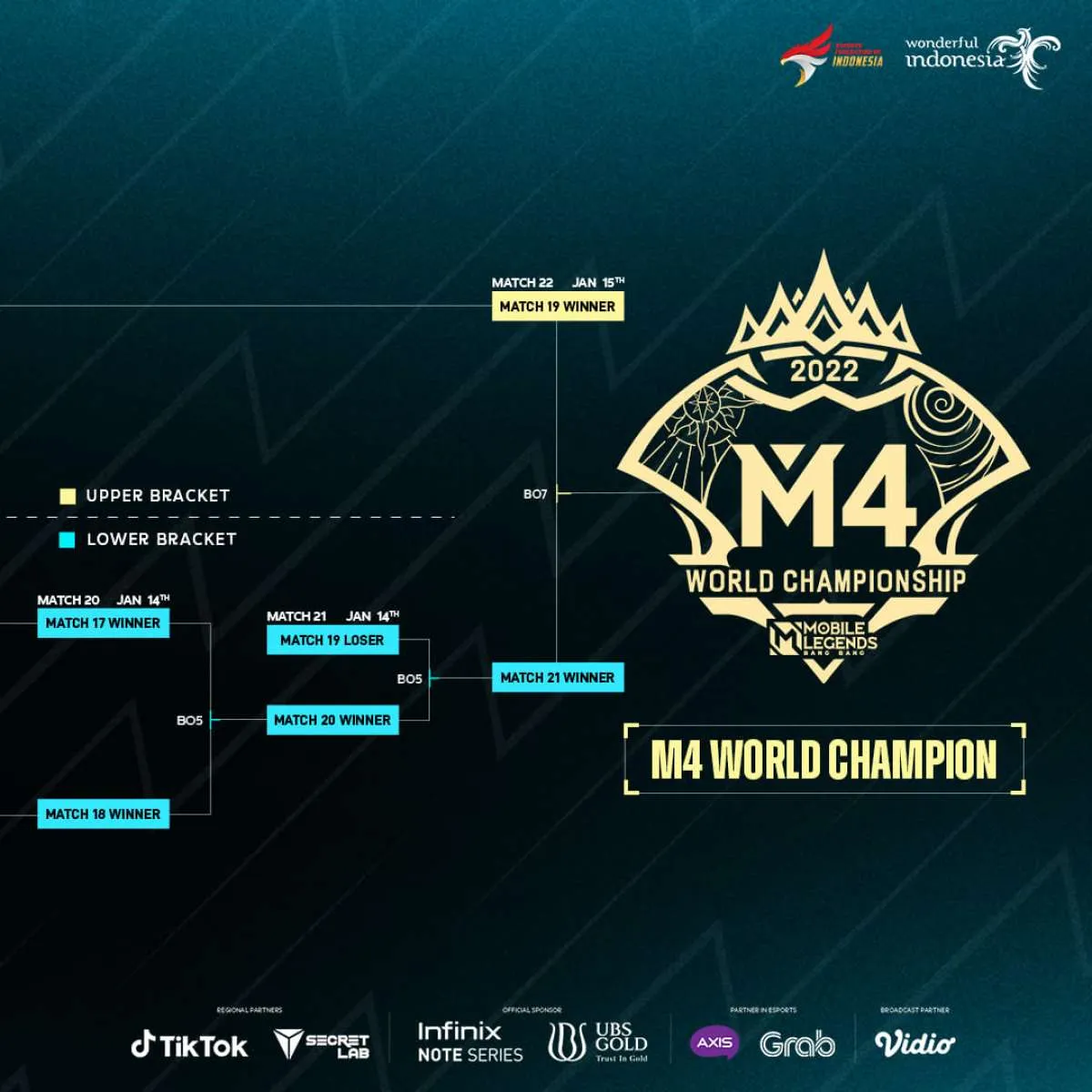 Seluruh tim peserta Mobile Legend M4 telah bertanding di fase grup selama 4 hari terakhir. Kini, kompetisi tersebut sudah mendapatkan nama-nama tim yang lolos ke upper bracket dan lower bracket.