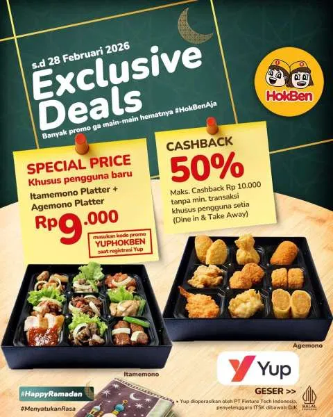 Dikutip dari Instagram @hokben_id, untuk pengguna baru Yup, Anda bisa menikmati Itamemono Platter + Agemono Platter hanya Rp 9.000. Syaratnya dengan memasukkan kode promo "YUPHOKBEN" saat registrasi Yup.