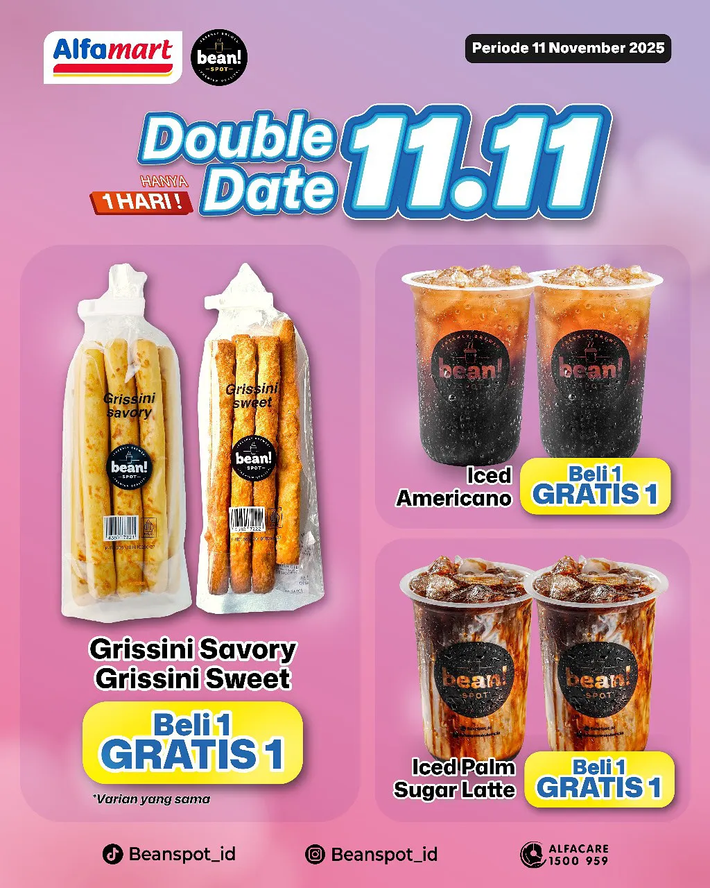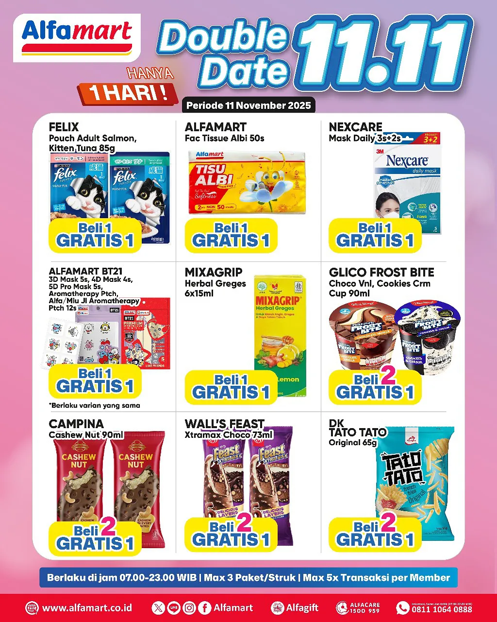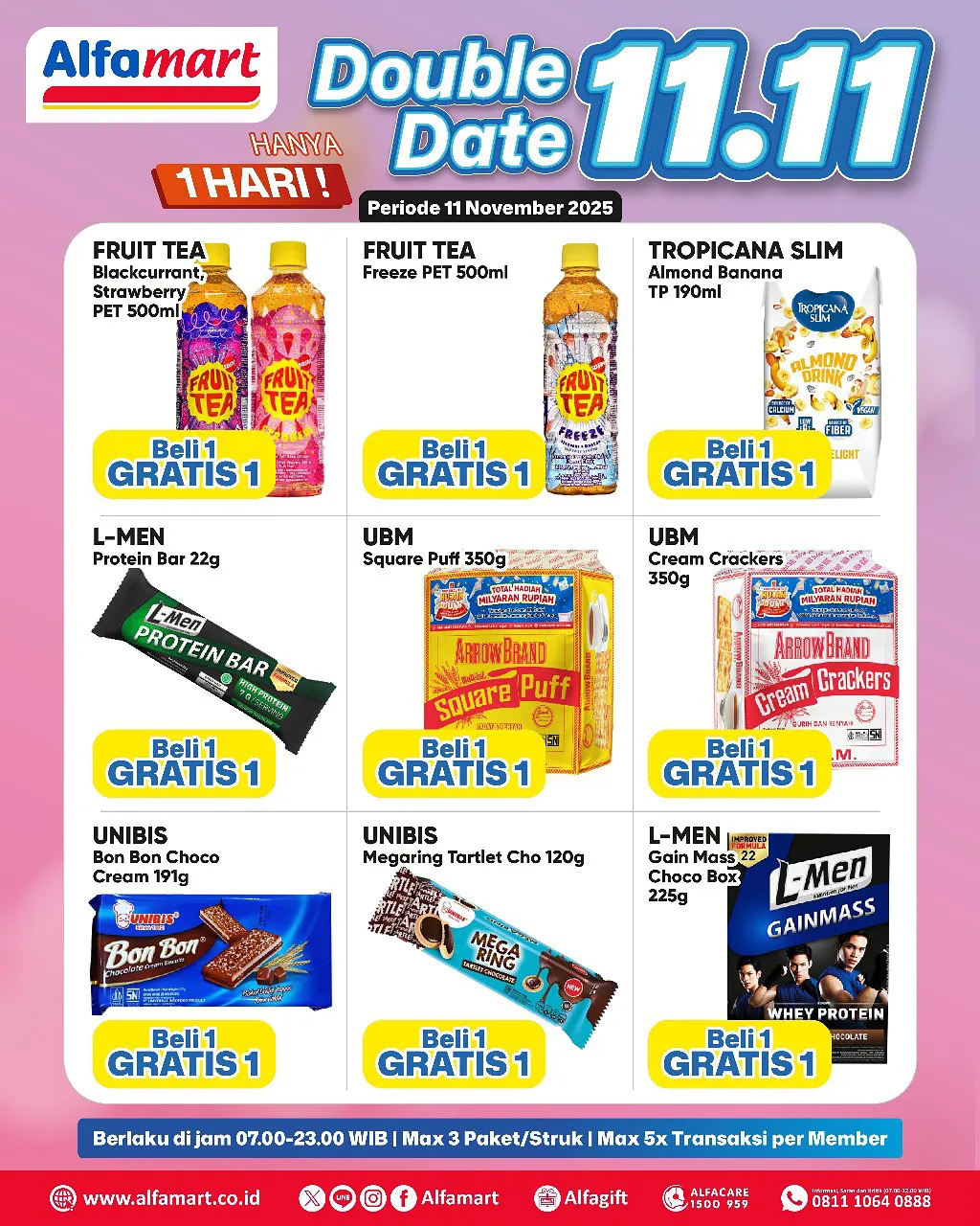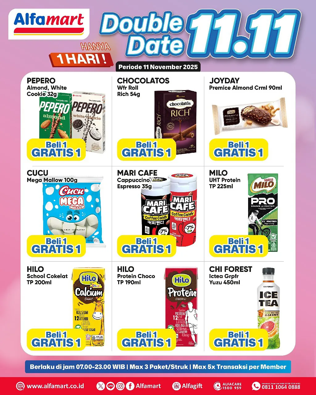 Dalam rangka memeriahkan momen tanggal kembar 11.11, ada promo 11.11 dari Alfamart yang menawarkan kesempatan Beli 1 Gratis 1, Beli 2 Gratis 1, dan Harga Spesial untuk belanja aneka produk.