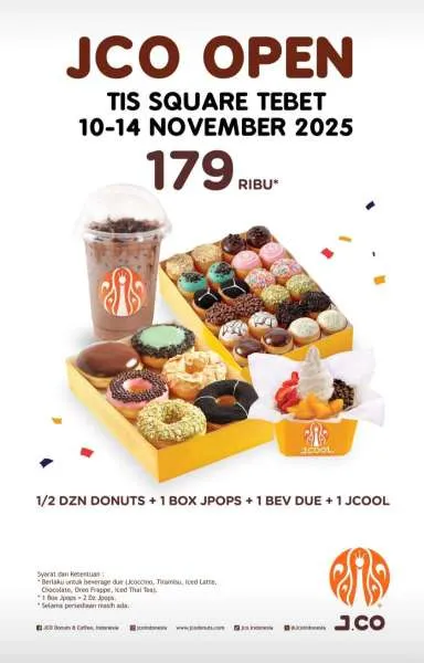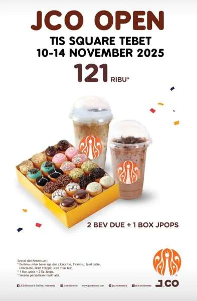Selain itu, dalam rangka pembukaan J.CO di TIS Square Tebet, Anda juga bisa menyerbu promonya sampai 14 November 2025. Ada penawaran paket menarik dengan harga spesial lo.