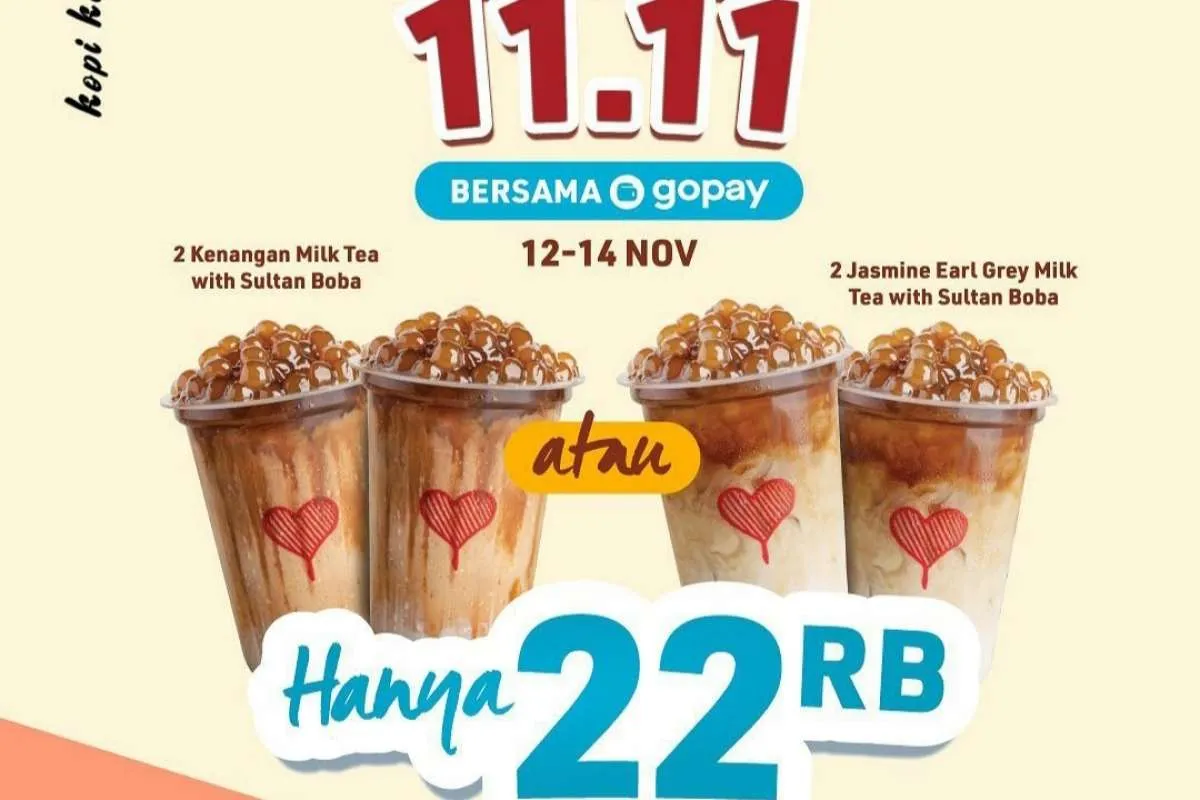 Promo 11.11 Kopi Kenangan Rp 22.000 dapat 2 minuman boba bisa dilakukan hanya pada pembelian langsung di outlet Kopi Kenangan dan hanya bisa dibeli dengan pembayaran via GoPay