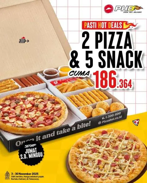 Selain itu, PHD juga ada promo spesial lainnya yang bisa Anda nikmati tiap Jumat-Minggu. Ada paket dua Pizza dan lima Snacks favorit dengan harga lebih hemat yang bisa Anda nikmati selama November 2025.