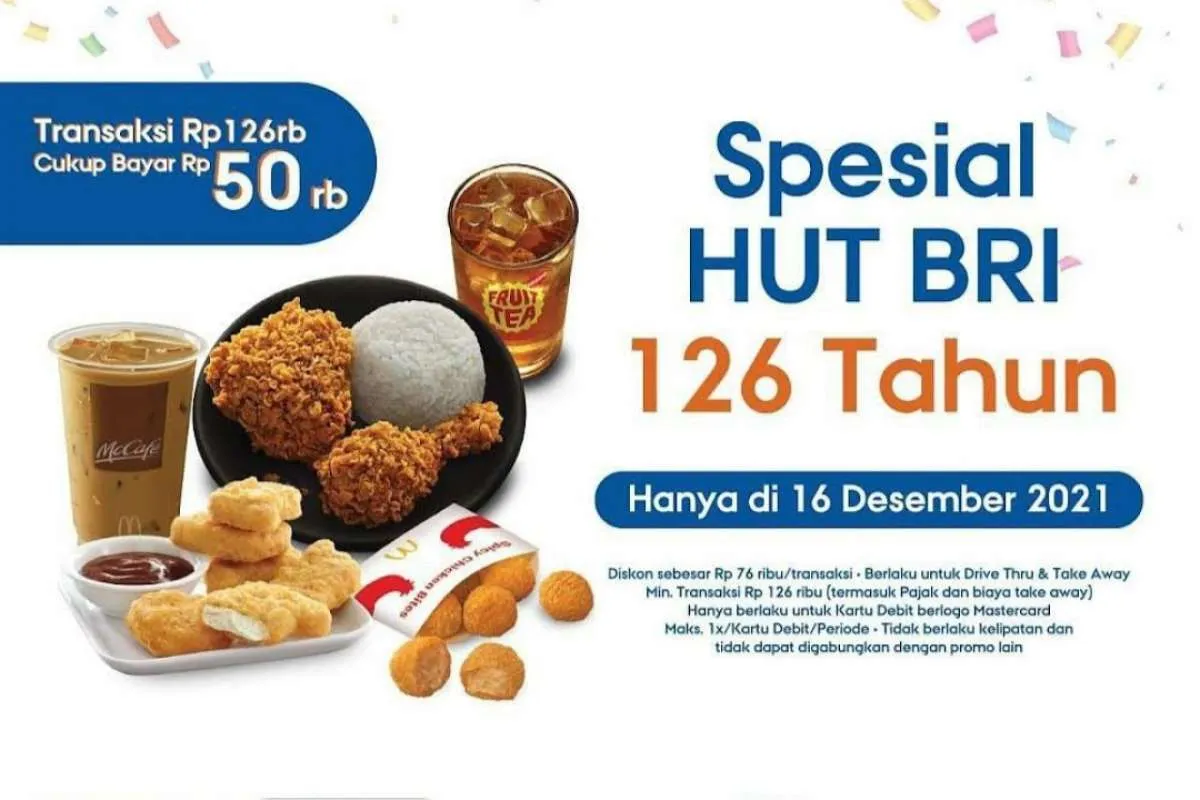 Di perayaan spesial HUT BRI x McD ini, apabila Anda bertransaksi senilai minimal Rp 126.000 (termasuk pajak dan biaya Take Away), maka Anda cukup membayar Rp 50.000 saja!