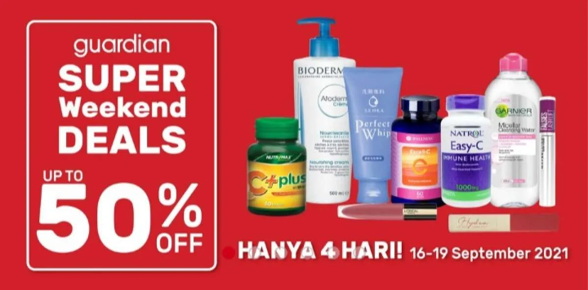 Promo Super Weekend Deals 16-19 September 2021 berlaku di Guardian seluruh Indonesia dengan perbedaan harga untuk wilayah Bali dan Batam.