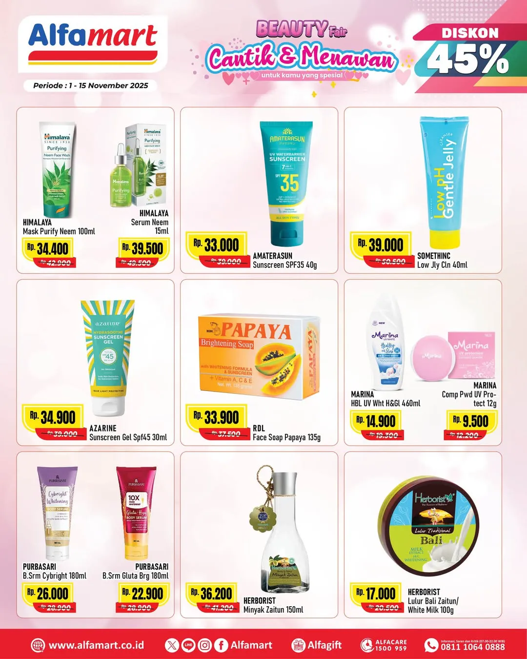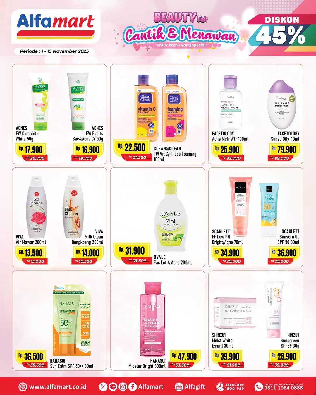 Selain lengkap, Alfamart juga kerap mengadakan promo dengan potongan harga. Sampai dengan tanggal 15 November 2025, ada promo Beauty Fair dari Alfamart yang menawarkan aneka produk kecantikan seperti skincare dan body care yang dibanderol dengan diskon hingga 45%.