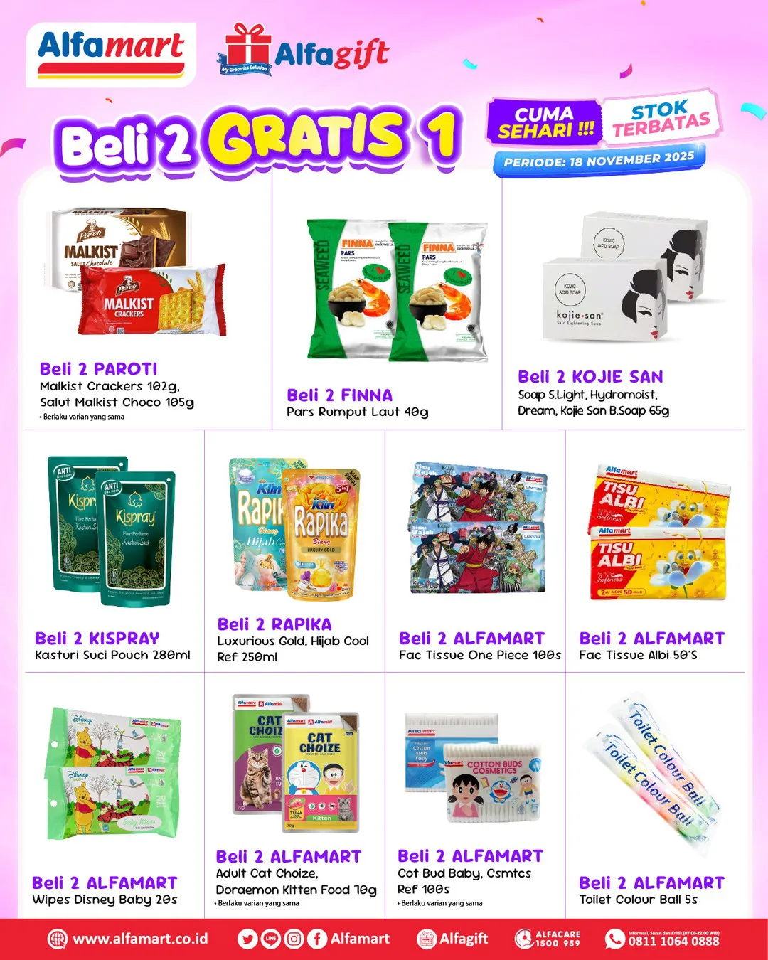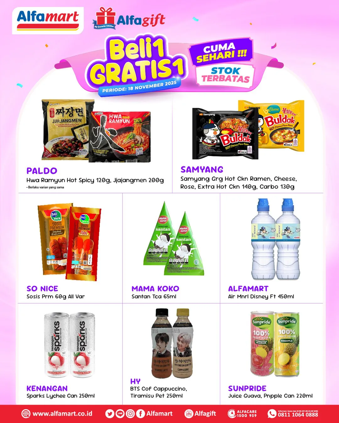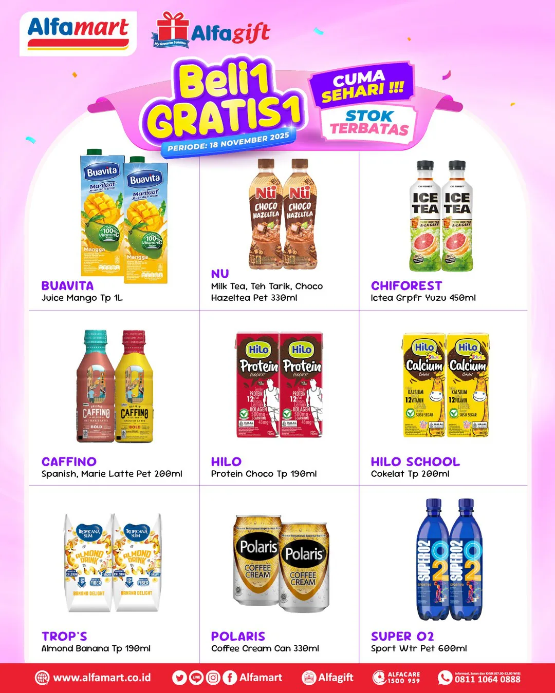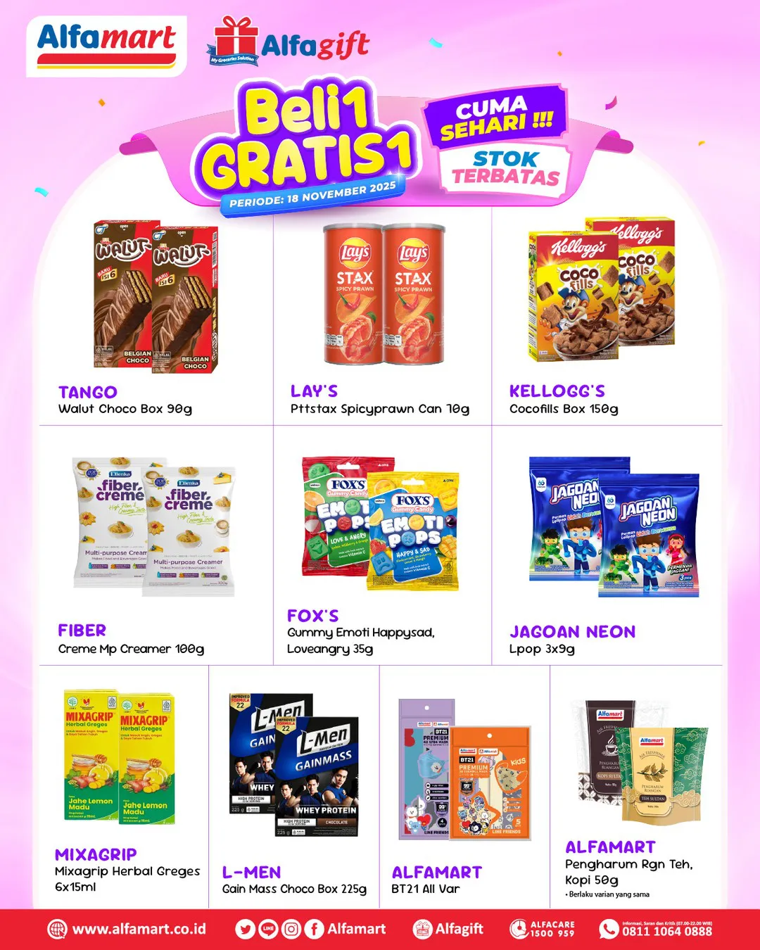 Khusus tanggal 18 November 2025, ada Promo Beli 1 Gratis 1 dari Alfamart yang menawarkan kesempatan Beli 1 Gratis 1, Beli 2 Gratis 1, dan Serba Gratis.