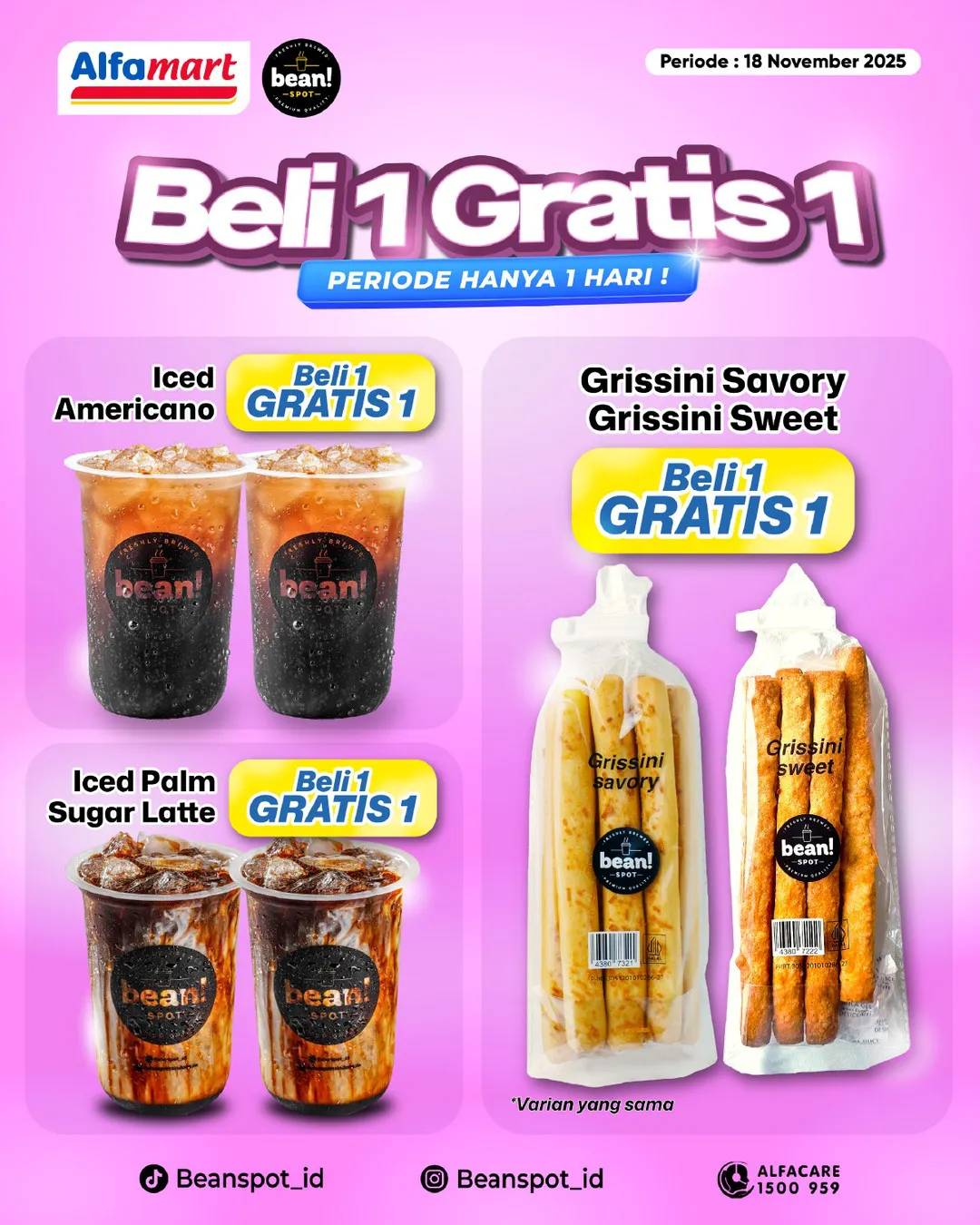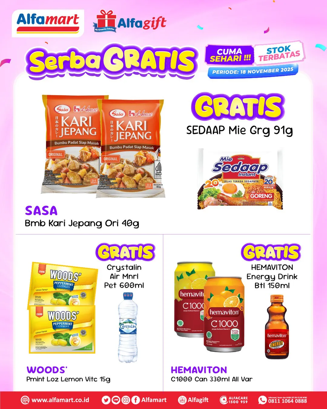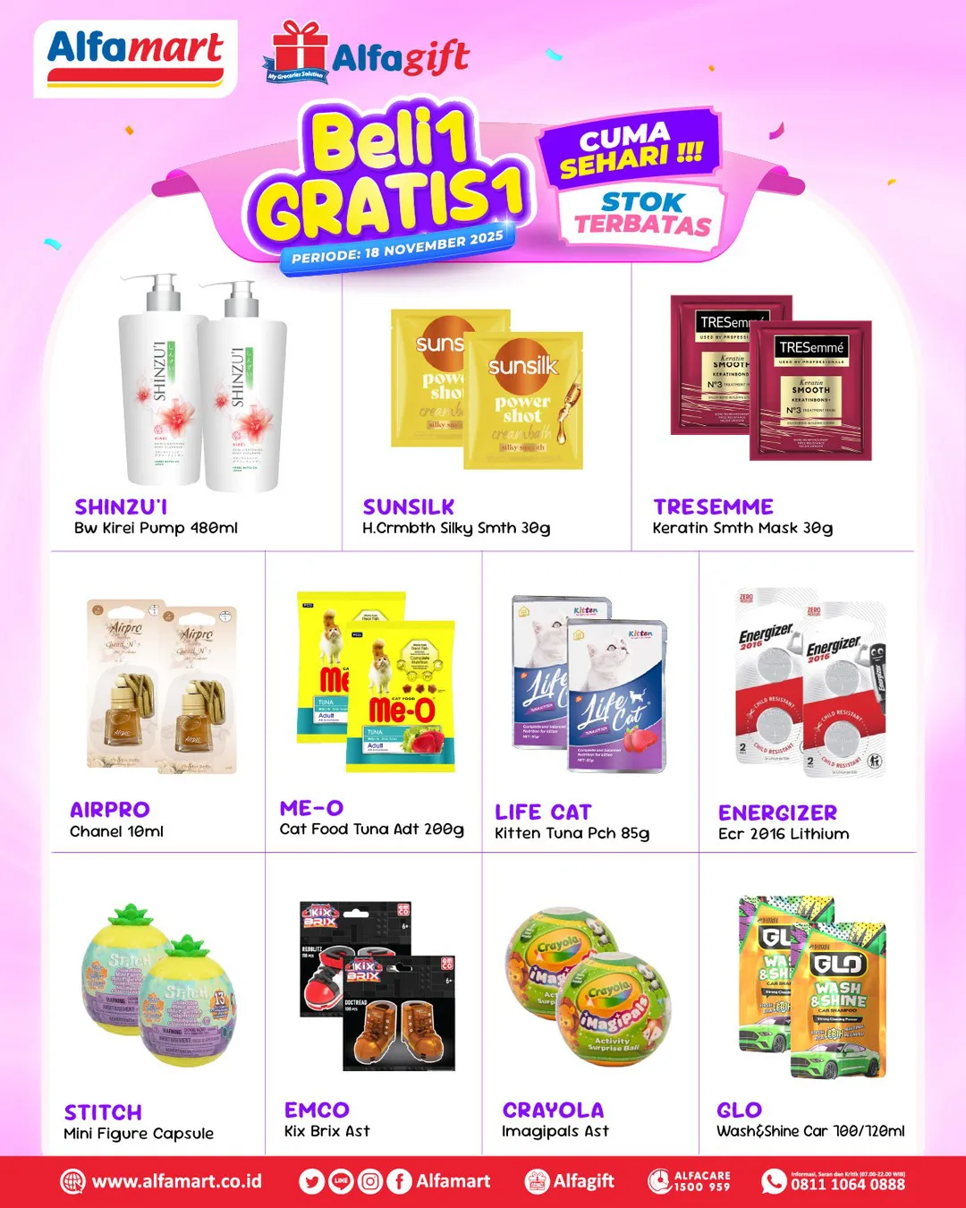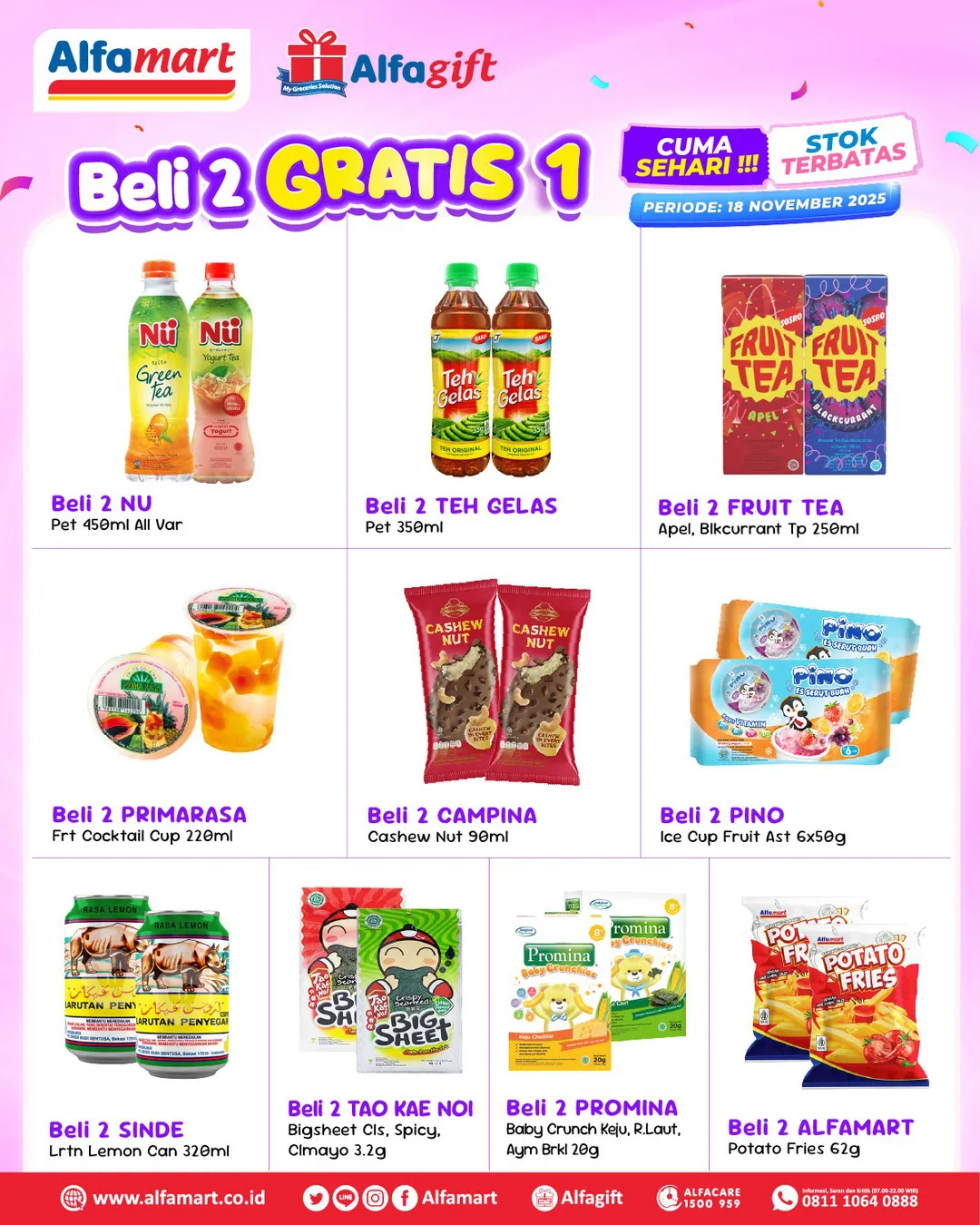 Khusus tanggal 18 November 2025, ada Promo Beli 1 Gratis 1 dari Alfamart yang menawarkan kesempatan Beli 1 Gratis 1, Beli 2 Gratis 1, dan Serba Gratis.