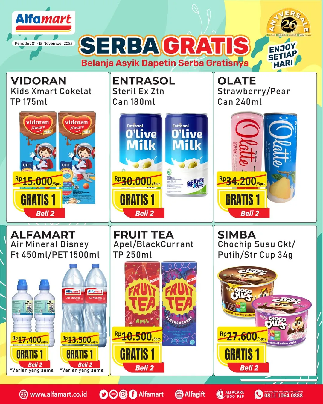 Selama 1-15 November 2025, ada Promo Serba Gratis dari Alfamart yang menawarkan kesempatan Beli 1 Gratis 1 dan Beli 2 Gratis 1.