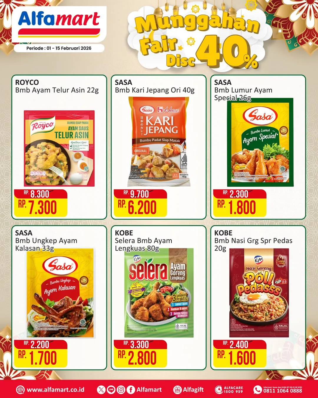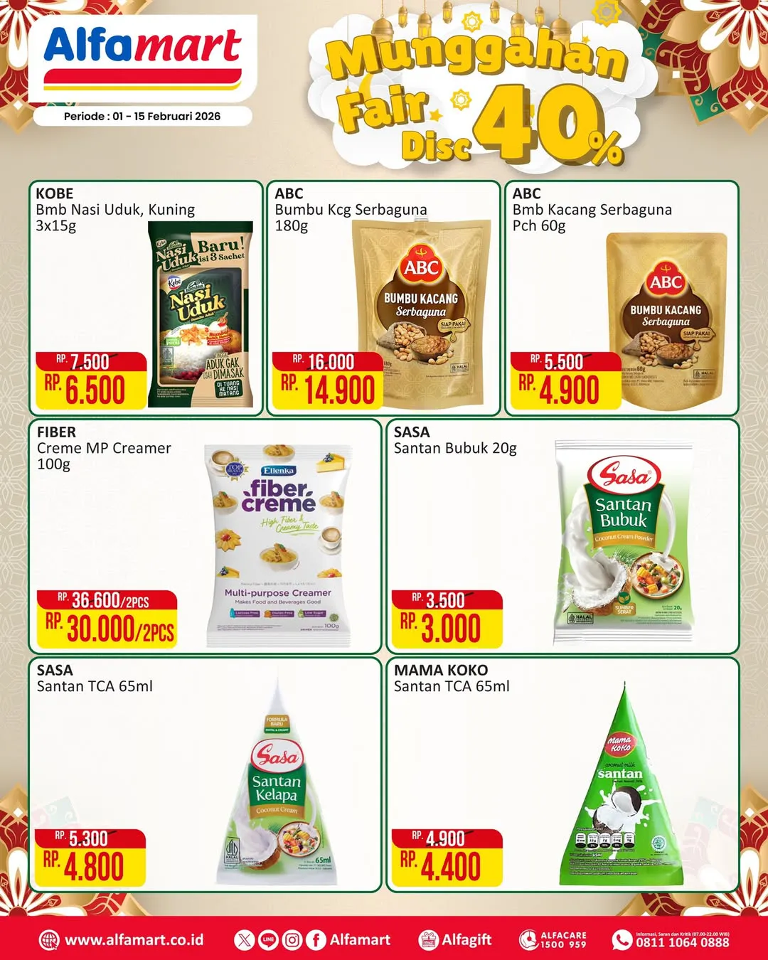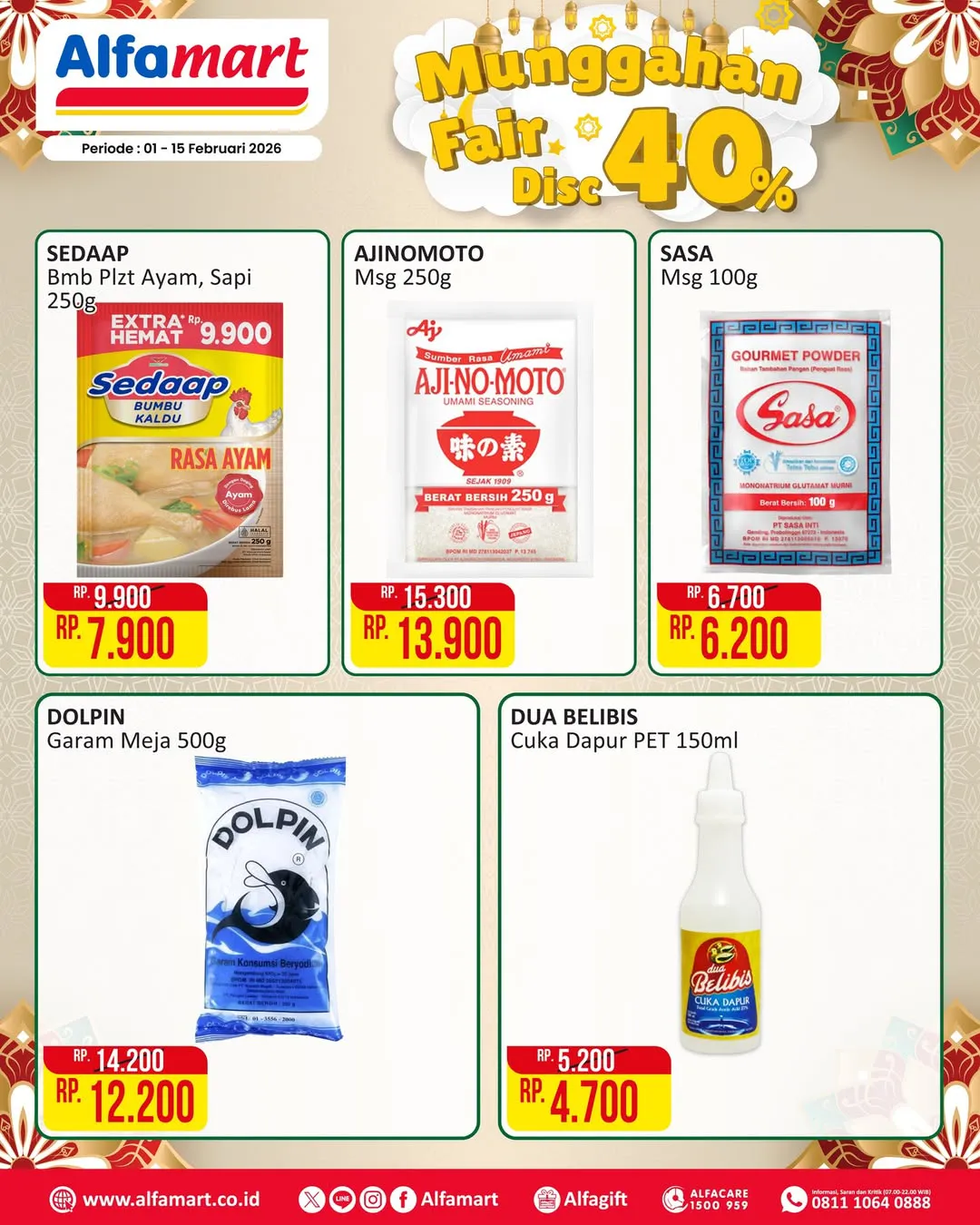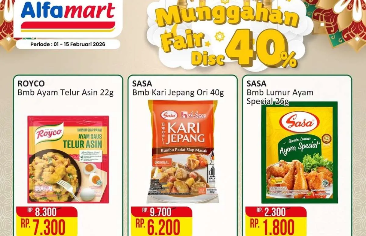 Selama 1-15 Februari 2026, ada promo Munggahan Fair dari Alfamart yang menawarkan berbagai kebutuhan dapur dengan diskon hingga 40%.