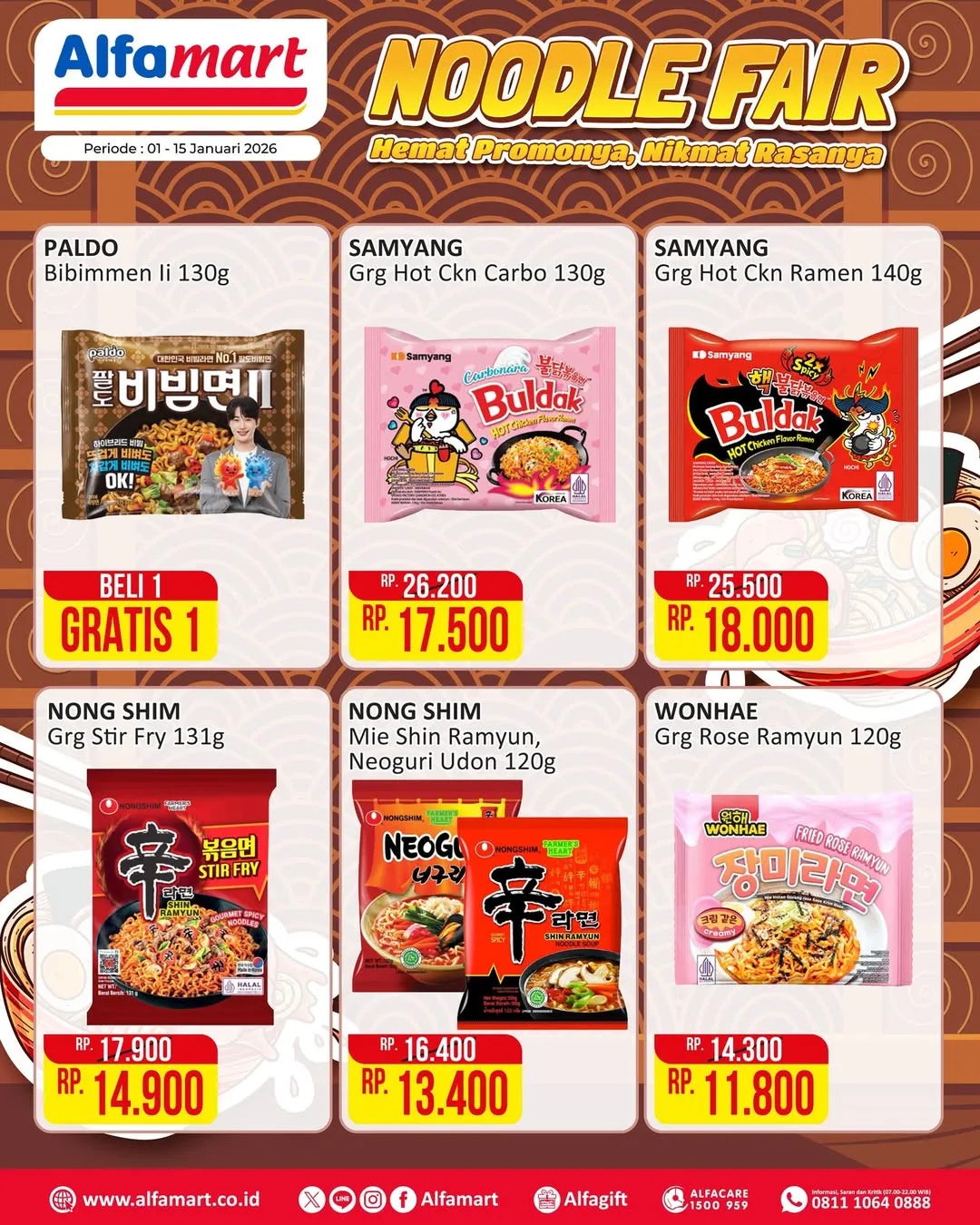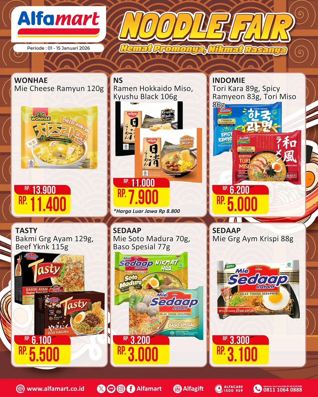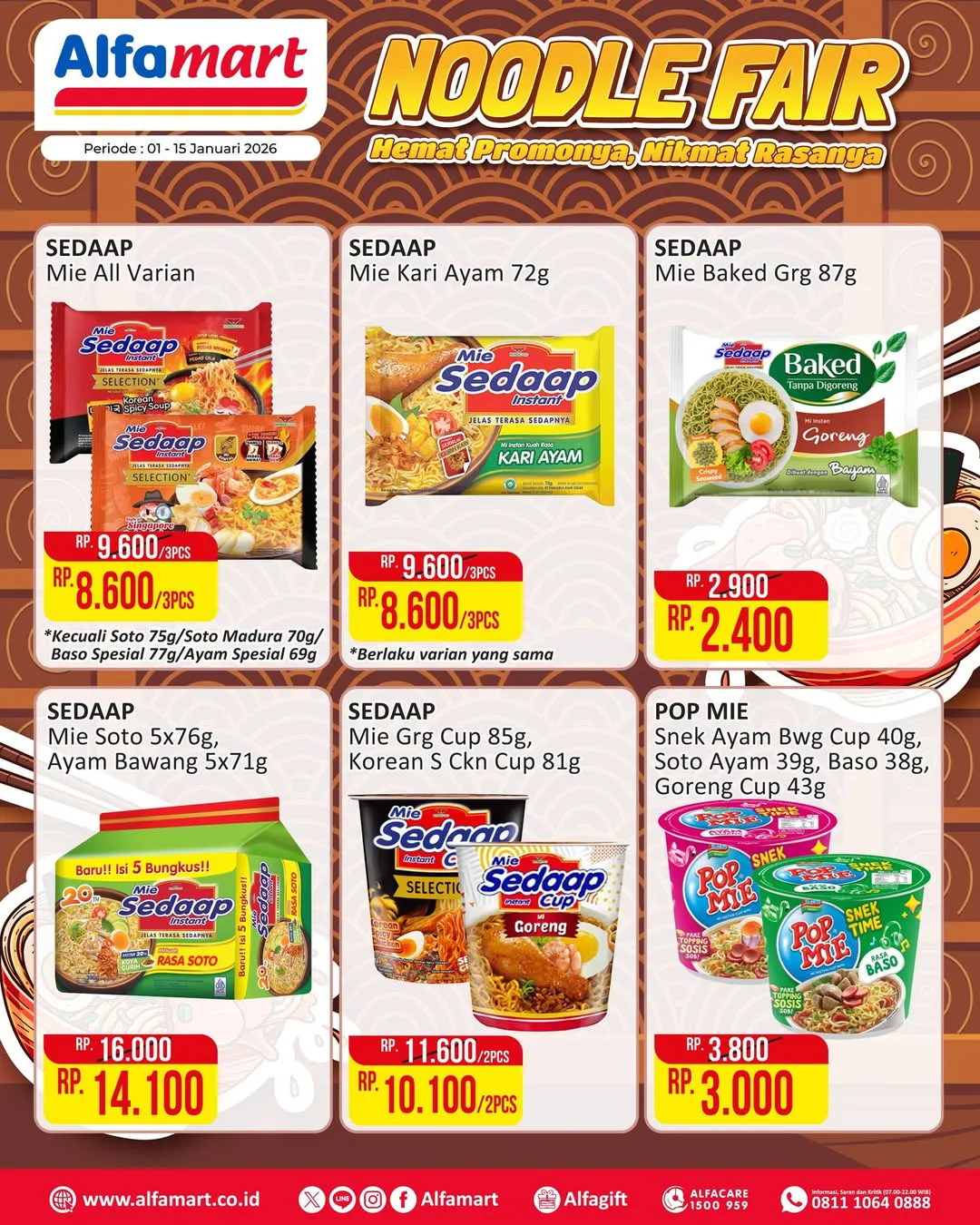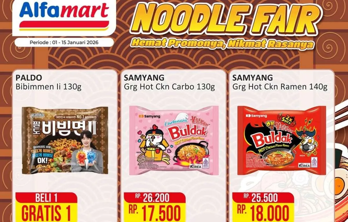 Selama 1-15 Januari 2026, ada promo Noodle Fair dari Alfamart yang menawarkan berbagai produk mi instan dengan harga jauh lebih ekonomis.