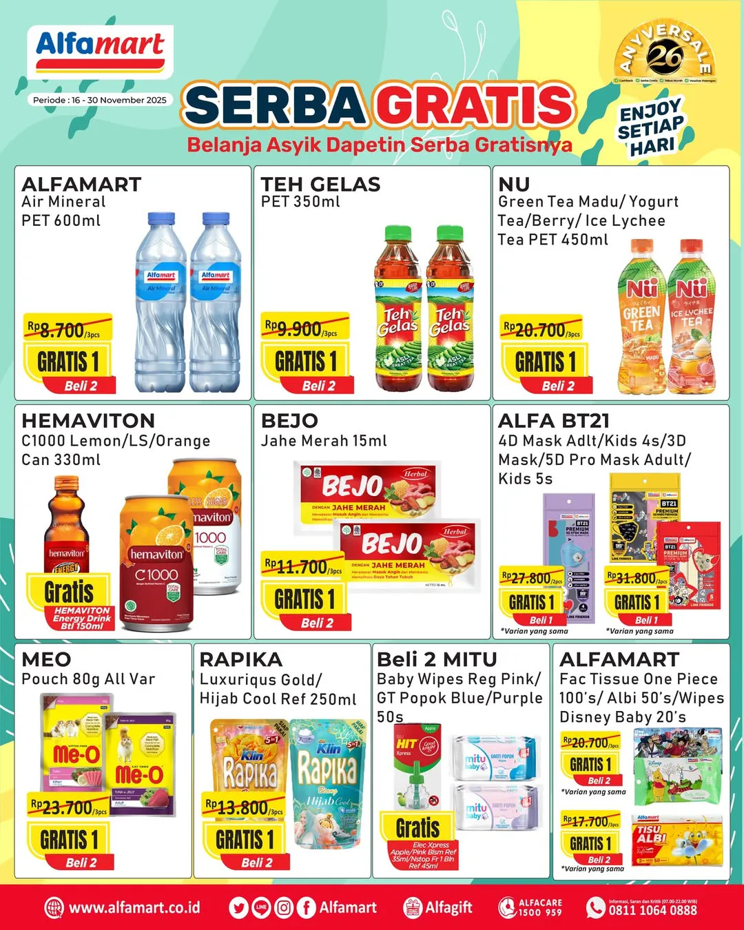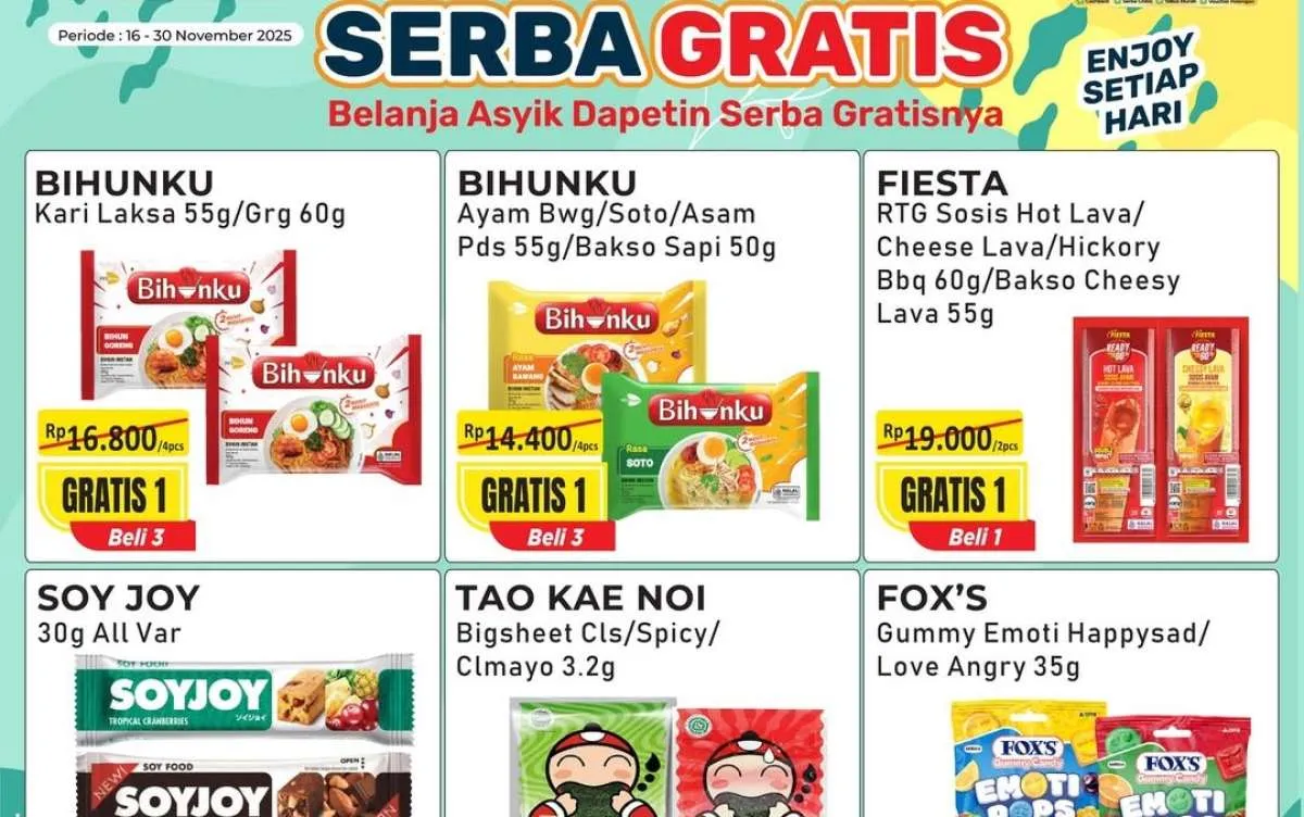Selain lengkap, Alfamart juga kerap mengadakan promo dengan potongan harga. Selama 16-30 November 2025, ada Promo Serba Gratis yang menawarkan kesempatan Beli 1 Gratis 1, Beli 2 Gratis 1, dan Beli 3 Gratis 1 untuk beragam produk.