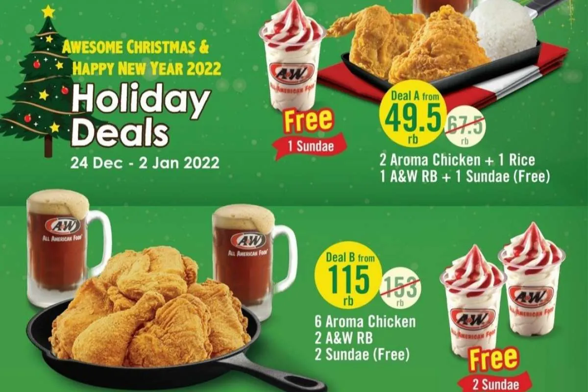 Pada promo Holiday Deals dari A&W yang dilansir dari Instagram @awrestoran, Anda punya kesempatan membeli paket makanan dengan isi beragam macam, mulai dari ayam, kentang, minuman hingga es krim sundae dengan berbagai varian pilihan!