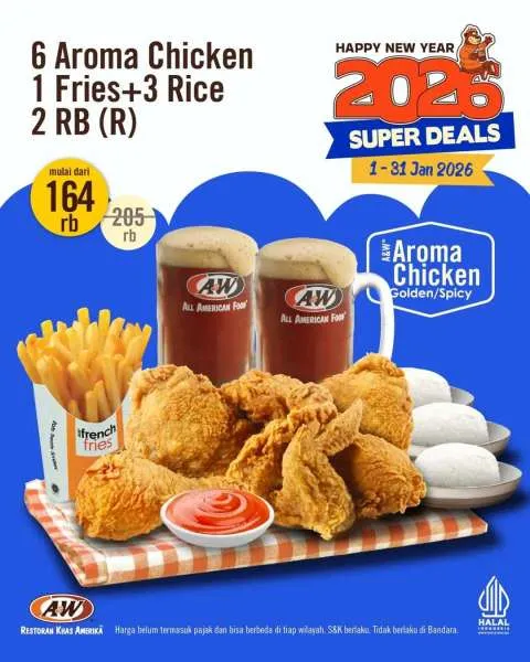 - 6 Aroma Chicken + 1 Fries + 3 Rice + 2 RB (R) (mulai Rp 164.000)