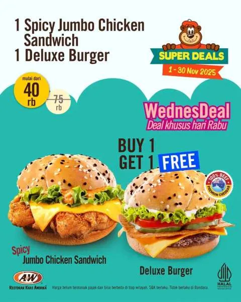 MOMSMONEY.ID - Nikmati promo A&W WednesDeal tiap Rabu selama November 2025. Anda bisa mendapatkan Spicy Jumbo Chicken Sandwich dan Deluxe Burger mulai Rp 40.000 saja, lo.
