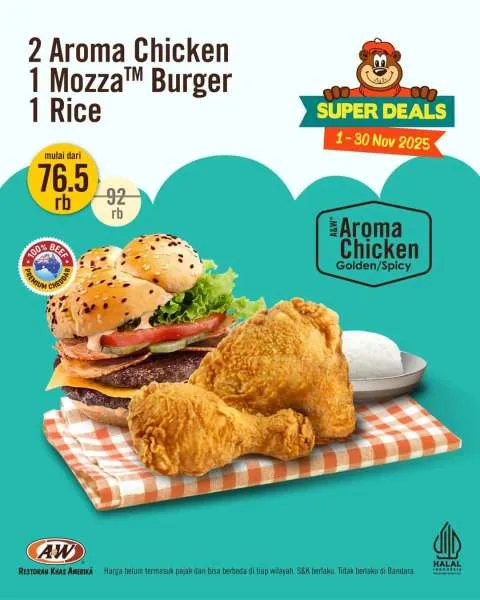 Dikutip dari Instagram A&W Restoran Indonesia, mulai Rp 76.500 saja, Anda sudah mendapatkan paket 2 Aroma Chicken + 1 Mozza Burger + 1 Rice, yang harga normalnya Rp 92.000. /2025/11/05/1452388290p.jpg)