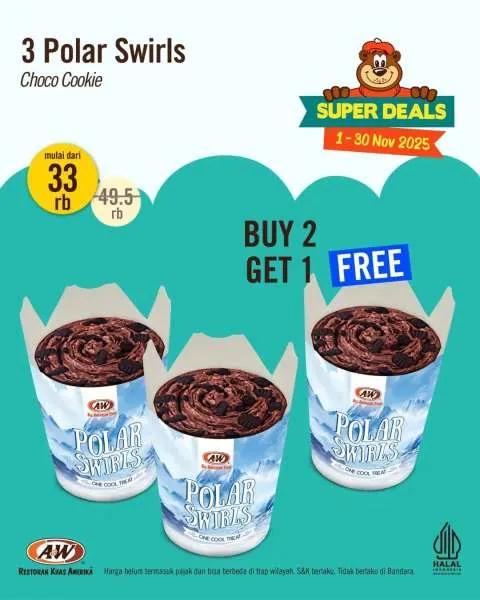 Makan di A&W kurang lengkap kalau belum menikmati yang segar-segar berupa Polar Swirls. Di promo Super Deals selama November ini, Anda bisa menikmati 3 Polar Swirls dengan harga yang lebih hemat.