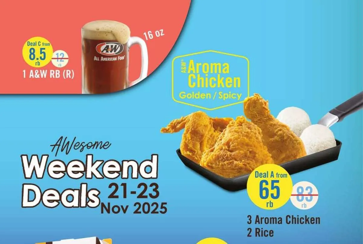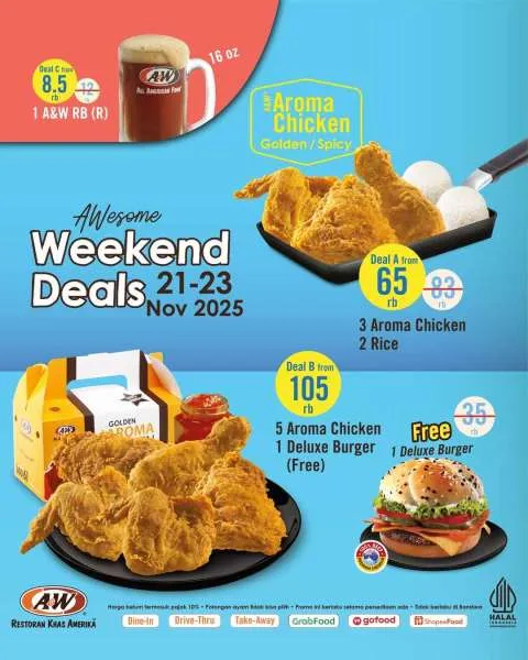 Dikutip dari Instagram A&W Restoran Indonesia, promo Weekend Deals menyediakan dua pilihan paket hemat Aroma Chicken mulai 21-23 November 2025 berikut:
