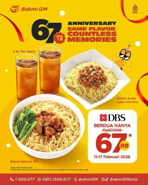 MOMSMONEY.ID - Merayakan ulang tahun ke-67, Bakmi GM menghadirkan penawaran spesial promo Anniversary dengan DBS selama seminggu saja.
