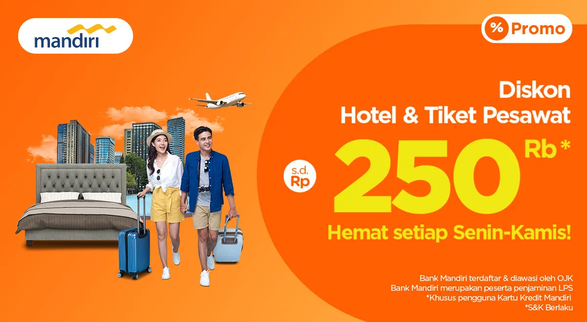 MOMSMONEY.ID - Khusus hari Senin s.d Kamis, Anda bisa menikmati liburan hemat hingga Rp250.000. Nikmati diskon menarik dari Bank Mandiri, bikin liburan Anda makin seru. Baca syarat & ketentuan berlaku di bawah ini, ya. Periode Booking promo ini s.d. 7 Januari 2022. Tentunya, periode keberangkatan dan menginap bisa kapan saja.