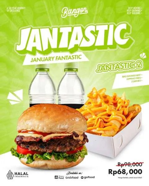 - Jantastic 2 (Rp 68.000): BBQ Smoked Beef + Dipping Fries + 2 Drinks