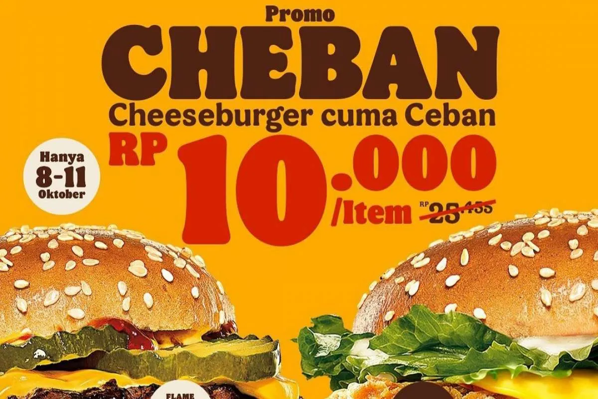 Promo “Cheban” Cheeseburger cuma ceban (Rp 10.000) per item kini bisa anda dapatkan secara terbatas. Hanya tersedia 3 hari saja, mulai 8-11 Oktober 2021 bagianda yang ingin menikmati promo Cheeseburger dari Burger King dengan harga super hemat ini!