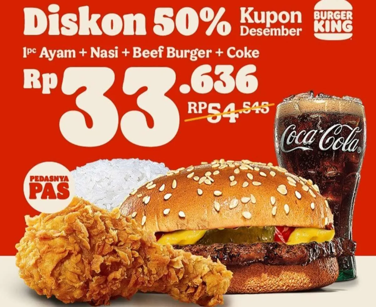 Mengutip dari Instagram @BurgerKing_id, promo bertajuk “Kupon Desember” merupakan promo 10 menu pilihan. Kesepuluh menu pilihan ini hanya dibanderol harga Rp17.727 saja.