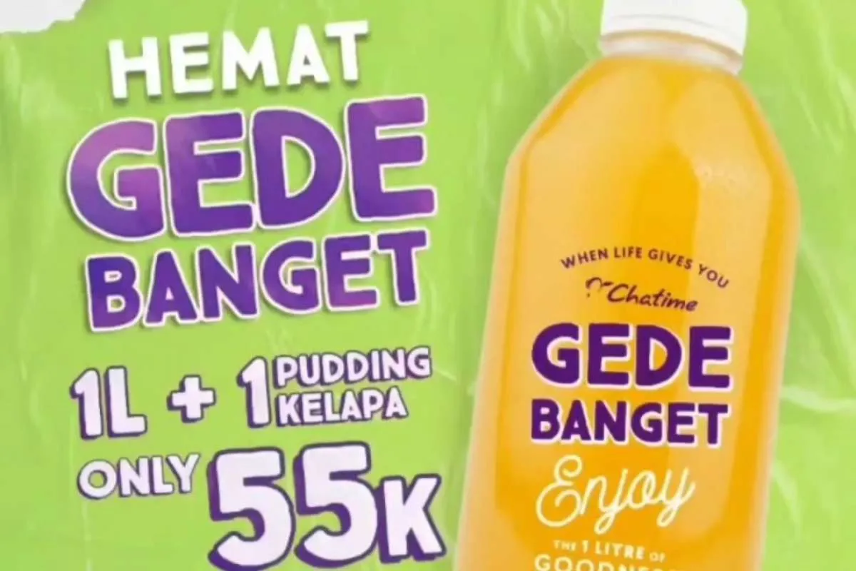 Melansir dari Instagram @chatimeindo, Chatime membawa promo yang bertajuk “Hemat Gede Banget”. Pada promo ini, Anda berkesempatan mendapatkan promo minuman 1 Liter & 1 Pudding Kelapa hanya dengan membayar Rp 55.000 saja!