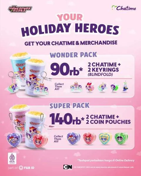 Selain itu, Chatime juga ada promo Your Holiday Heroes dengan minuman bertema The Powerpuff Girls Edition. Tak hanya bisa menikmati kesegaran minumannya yang unik, Anda juga bisa mengoleksi merchandise-nya yang lucu-lucu lo.