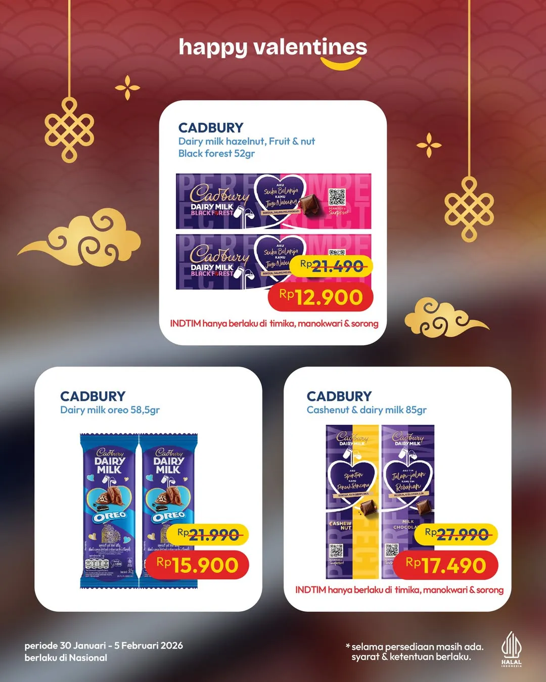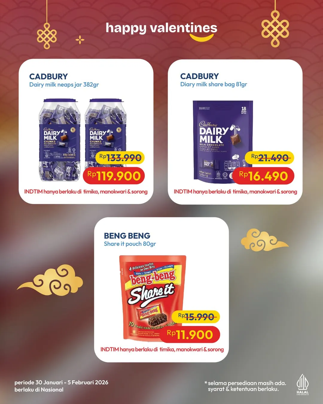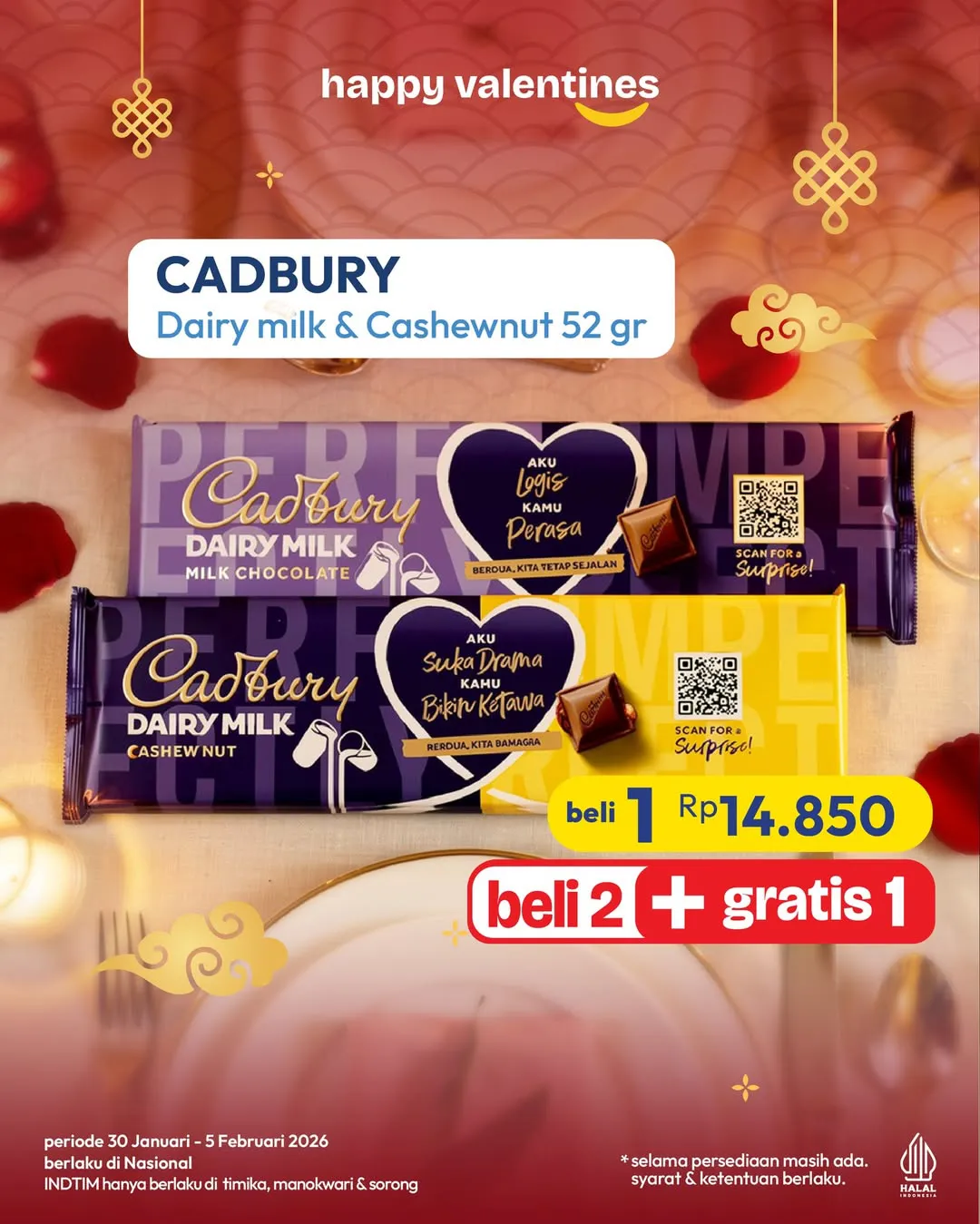 Promo ini menawarkan Harga Spesial hingga Beli 1 Gratis 1 untuk berbagai merek cokelat. Ada SilverQueen, Cadbury, Van Houten, Dark Wonder, dan Beng Beng. Tidak lupa, aneka permen dan wafer cokelat.