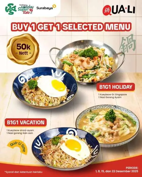 Selain itu, buat warga Surabaya ada promo spesial Buy 1 Get 1 dari Quali lo. Hanya dengan Rp 50.000 saja, Anda sudah bisa makan berdua di Quali pada tanggal-tanggal spesial.