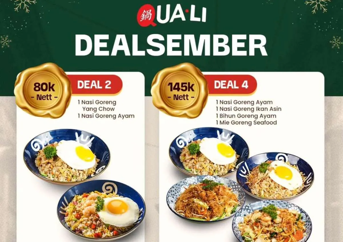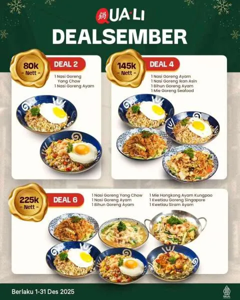 Selama Desember 2025, Quali hadir dengan promo paket hematnya yang siap manjakan Anda. Makan berdua, berempat, atau berenam, semuanya tersedia dengan menu-menu nikmat, tapi tetap aman di dompet.