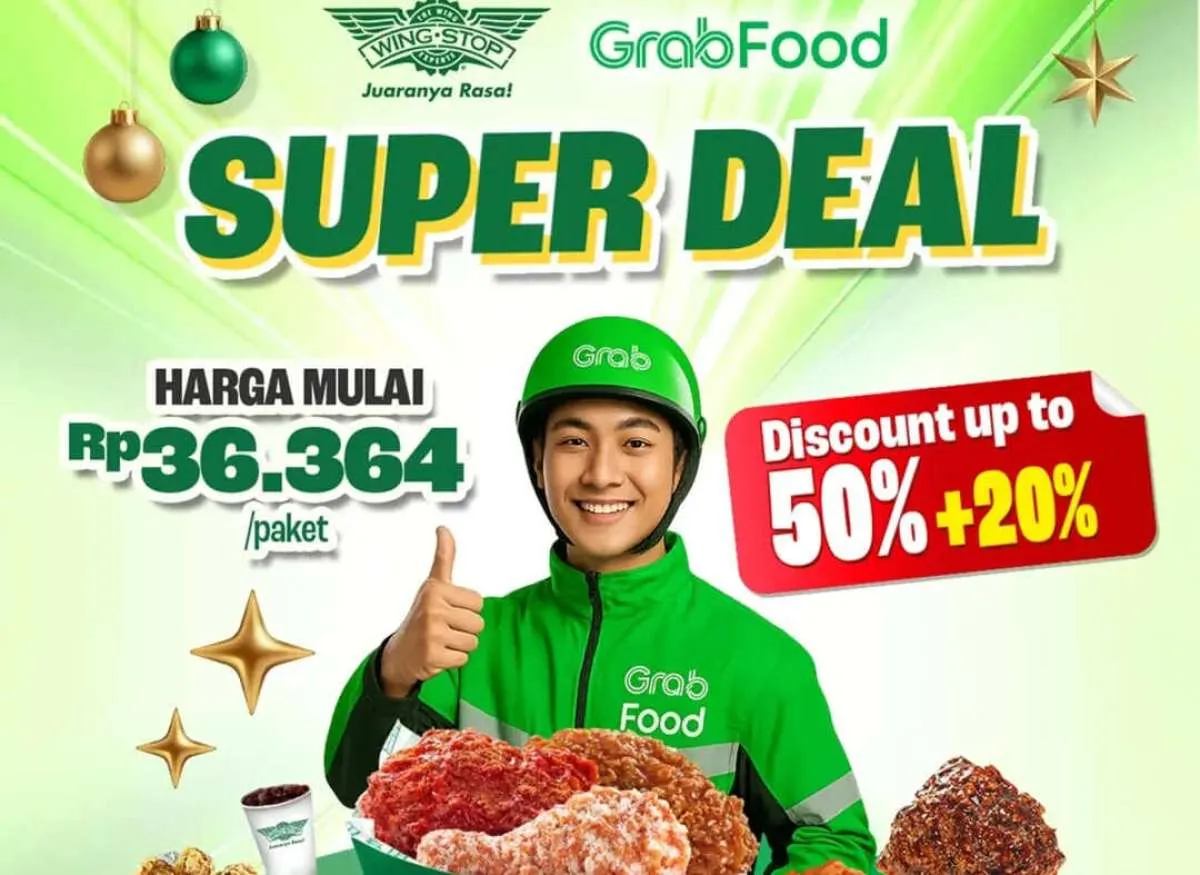 Liburan Natal dan Tahun Baru ingin di rumah saja sambil kumpul bareng keluarga? Jangan lupa pesan Wingstop biar momen kumpul makin seru ya. Karena ada promo Super Deal pakai GrabFood yang menyajikan beragam paket hemat dengan diskon sampai 50% dan ada tambahan 20% lagi.