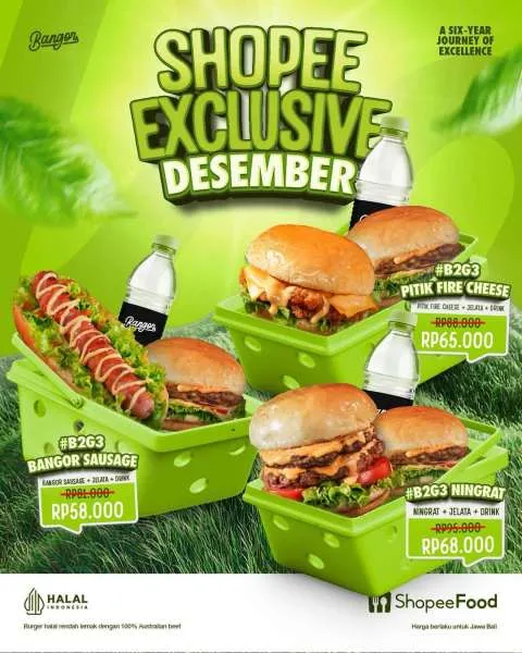 Selain itu, Burger Bangor juga ada promo Shopee Exclusive Desember dengan paket hemat mulai Rp 58.000. Semua serba praktis, cukup pesan lewat ShopeeFood saja, lo.