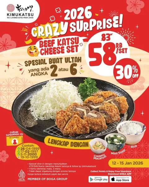 Melalui promo ini, ulang tahun Anda makin nikmat dengan hidangan Beef Katsu Cheese Set lengkap yang hematnya sampai 30%. Sajian Katsu ini siap menemani momen spesial dengan sensasi makan yang lebih memuaskan.